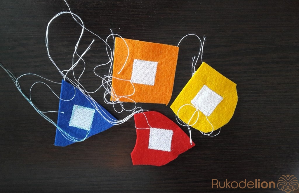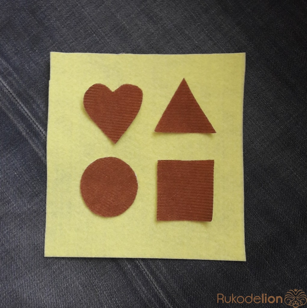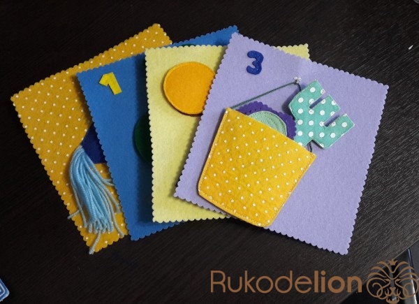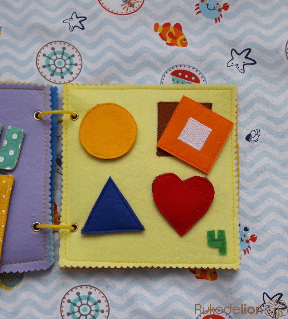 Вырезаем из велкроткани фигуры,приклеиваем и пришиваем их к основе.Из фетра вырезаем фигуры и кусочки фетра для них.На кусочки пришиваем жесткую часть липучки.На фетр кладем фигуры и прошиваем. Пришиваем к основе страницы цифру 4.
