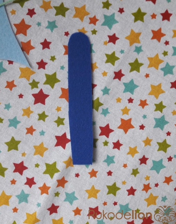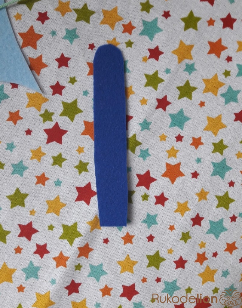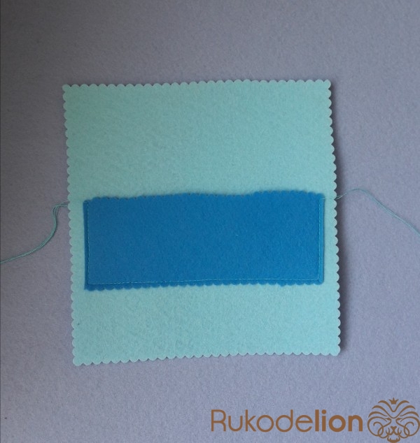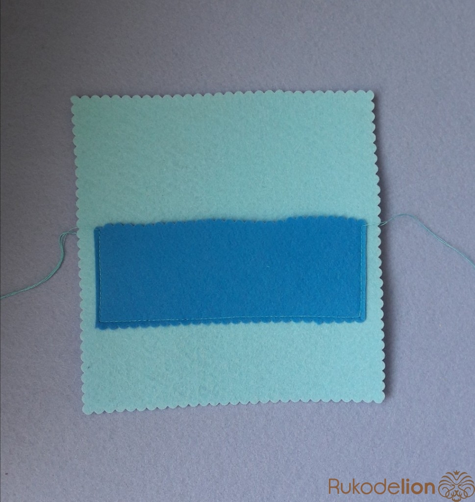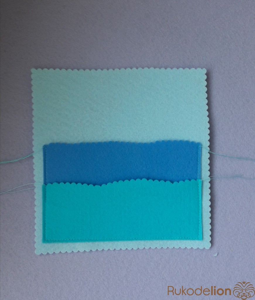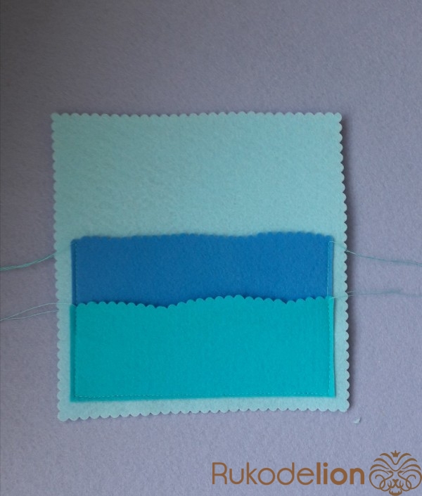Из голубого  и светло-синего вырезаем волны. Сначала пришиваем верхнюю волну, затем нижнюю. Пришиваем к основе страницы цифру 5.