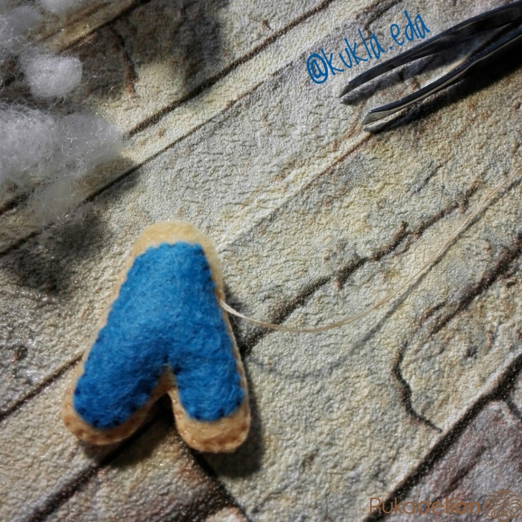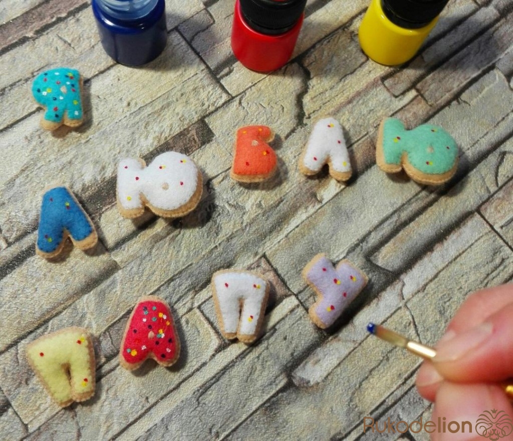 Сшиваю обе половинки буковки между собой и набиваю синтепухом. Глузурь в качестве декора рисую акриловой краской. Даю краске время высохнуть.