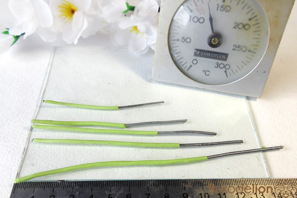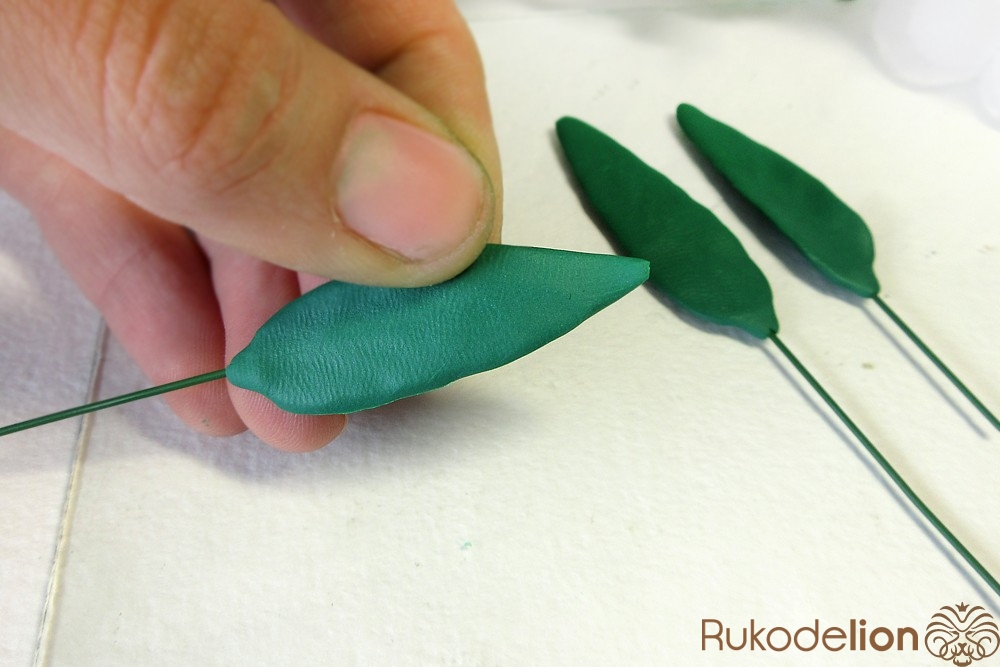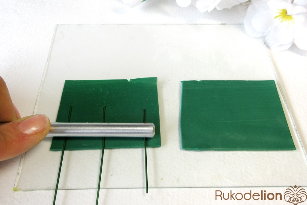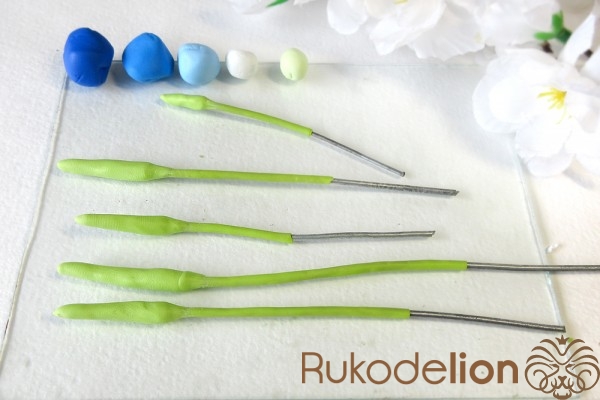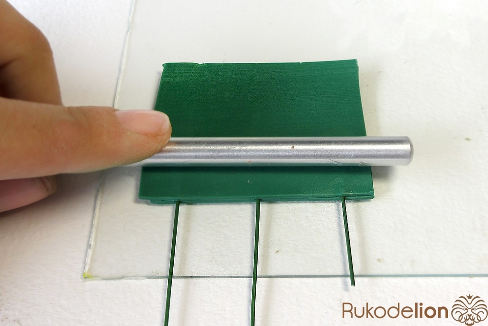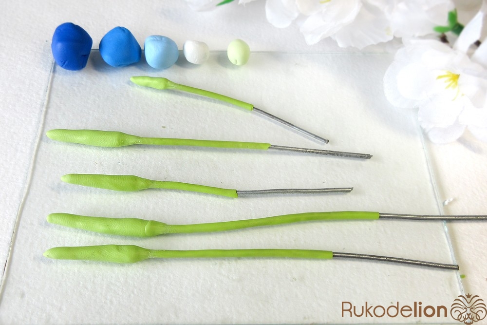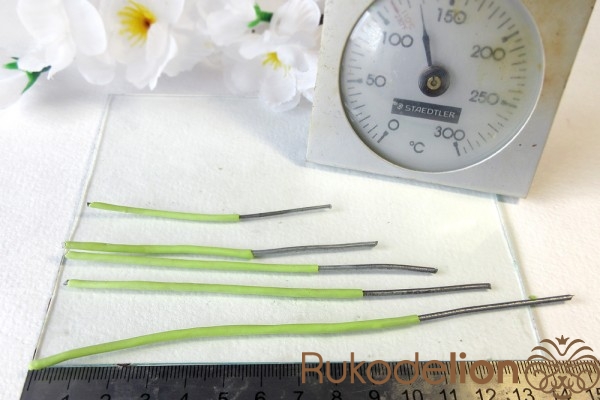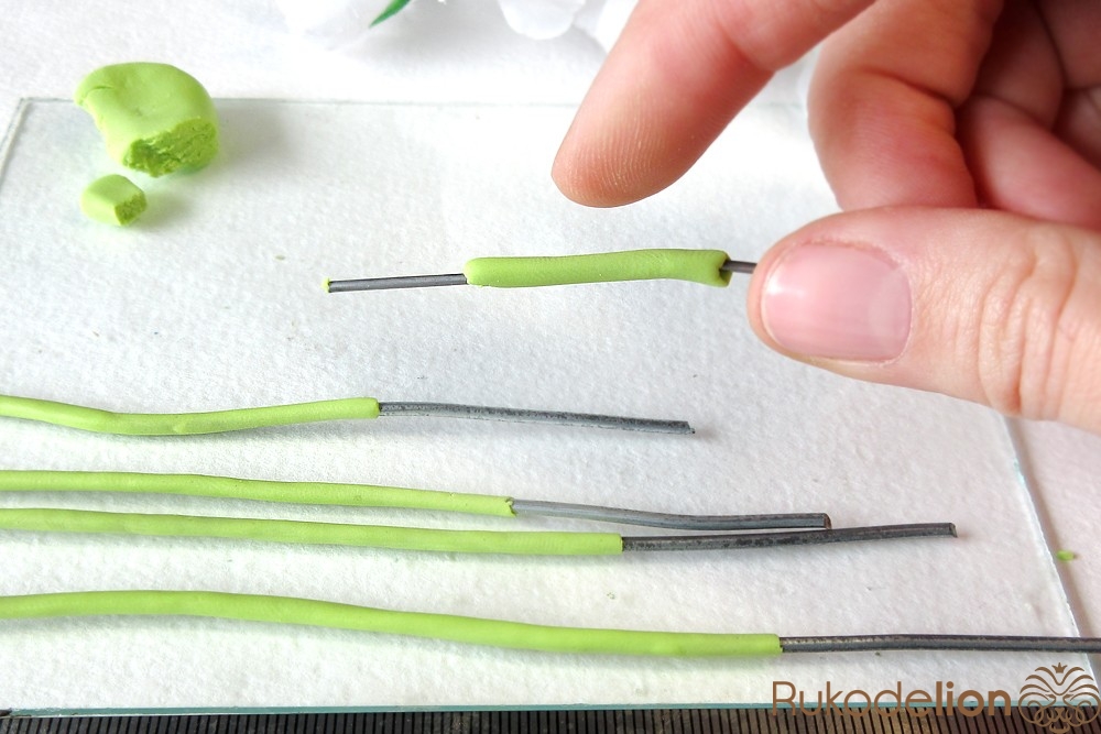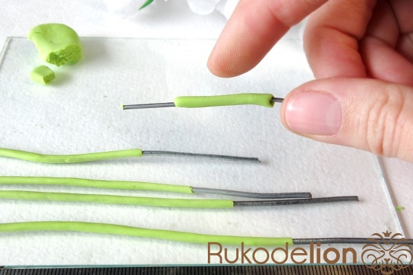 Теперь этой глиной нужно обтянуть проволочные отрезки. Для этого хорошо разомните небольшой кусочек глины, наденьте его на проволоку и растягивайте по проволоки глину равномерно, прокручивая ее в пальцах и растягивая глину к краям отрезка. Важно, чтобы стебли получились максимально ровными. При этом несколько сантиметров проволоки внизу стеблей оставьте без глины.