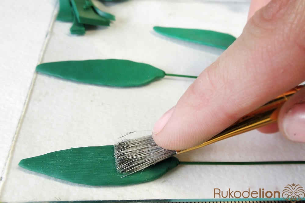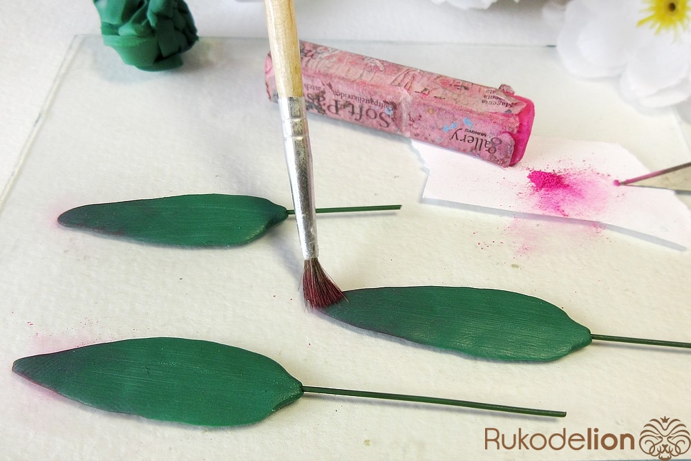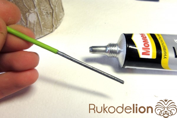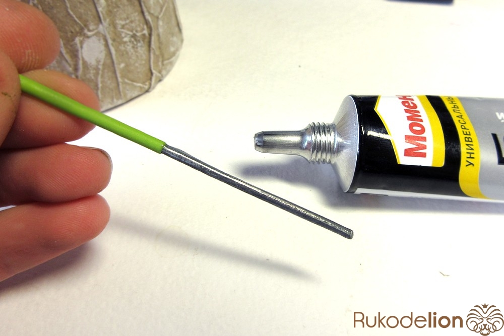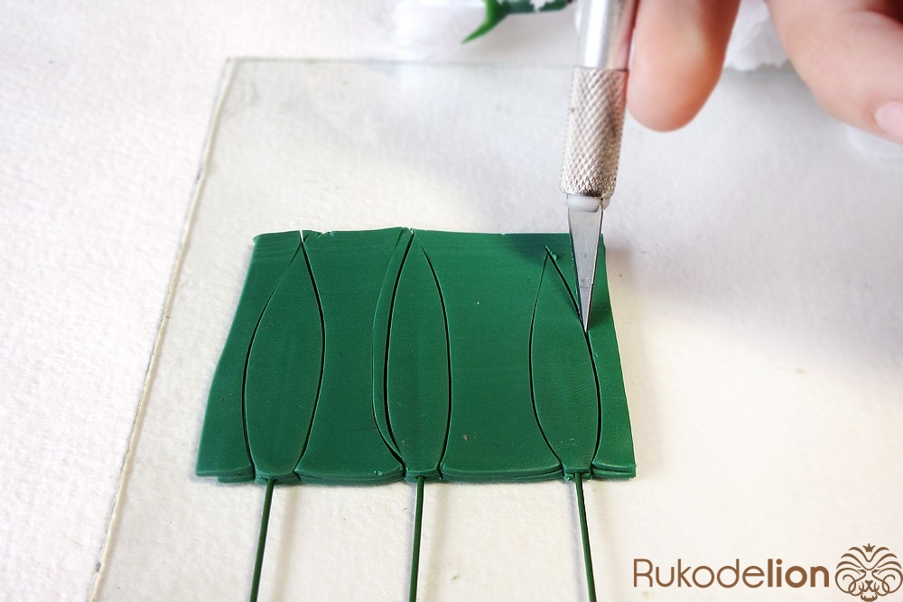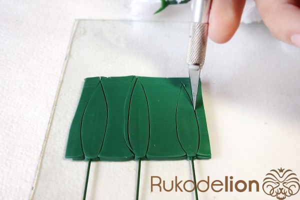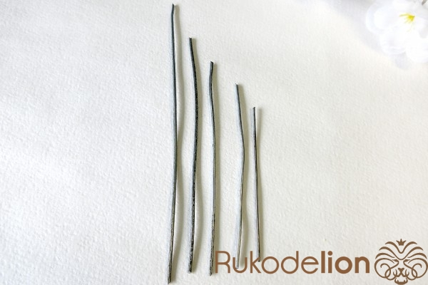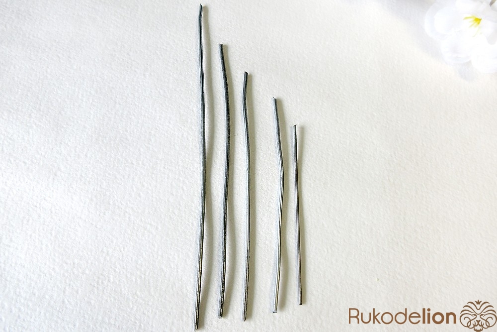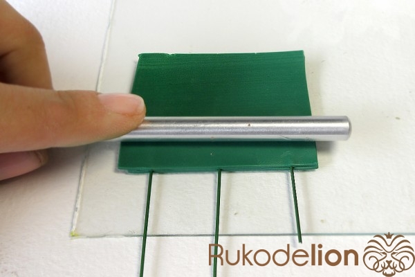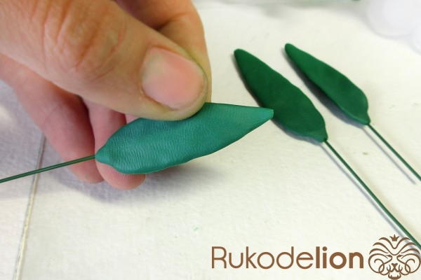 Теперь этой глиной нужно обтянуть проволочные отрезки. Для этого хорошо разомните небольшой кусочек глины, наденьте его на проволоку и растягивайте по проволоки глину равномерно, прокручивая ее в пальцах и растягивая глину к краям отрезка. Важно, чтобы стебли получились максимально ровными. При этом несколько сантиметров проволоки внизу стеблей оставьте без глины.