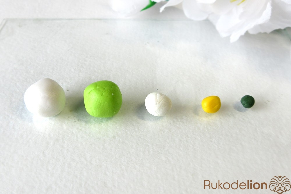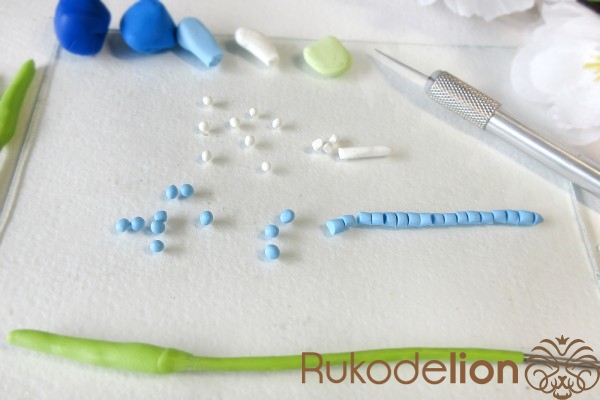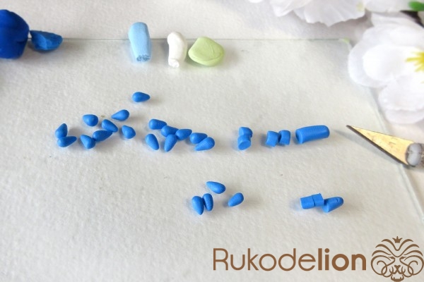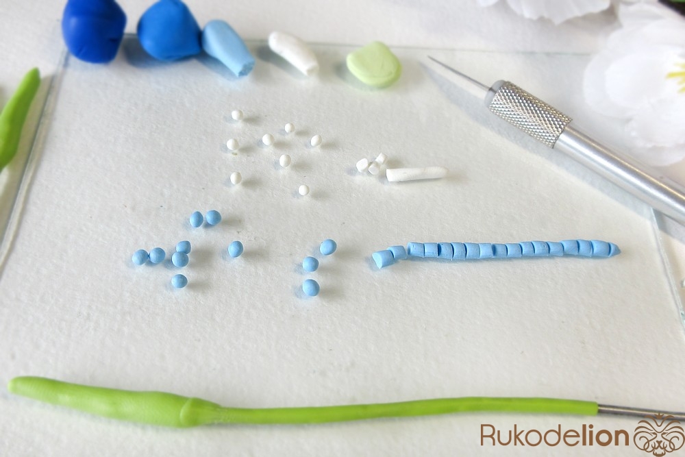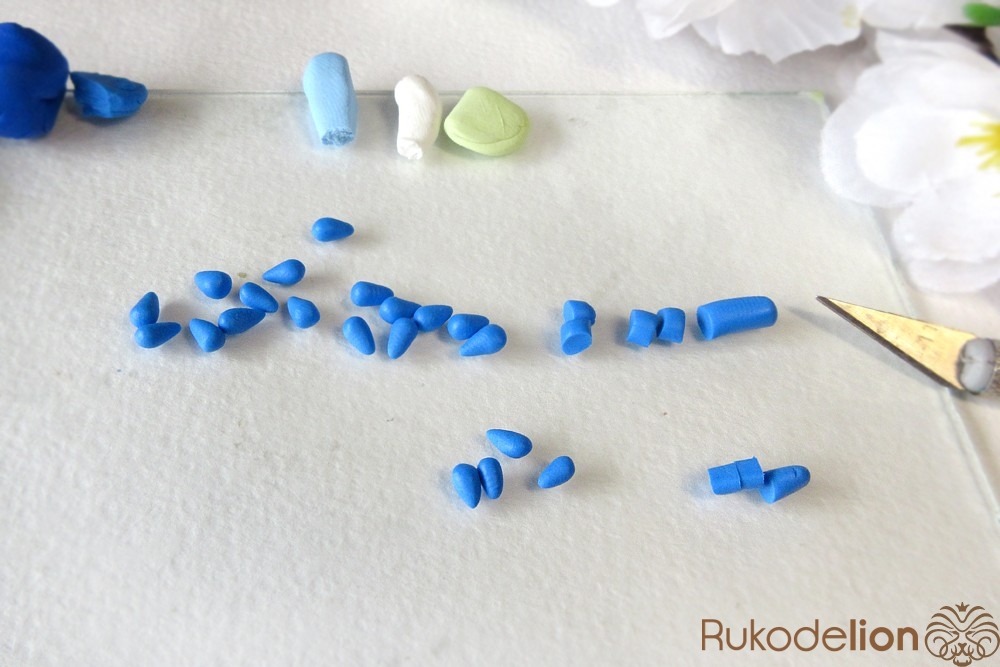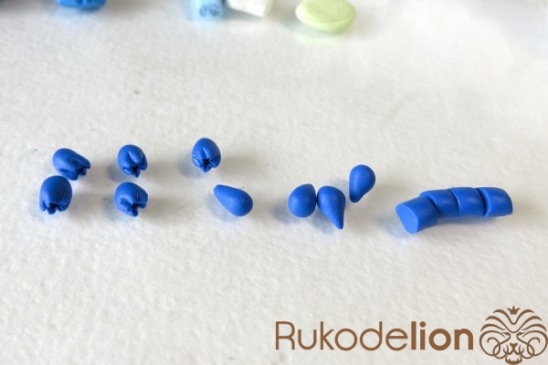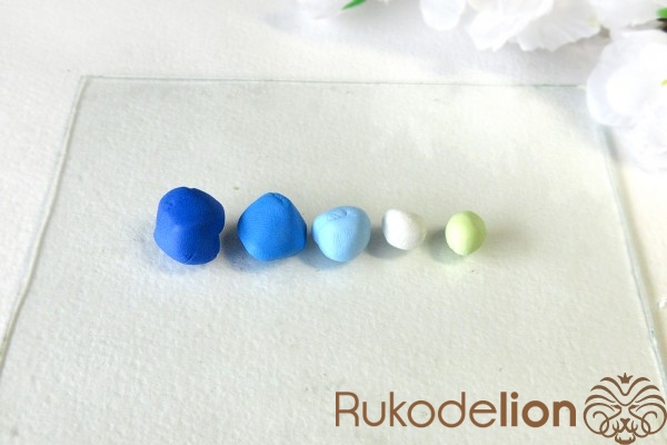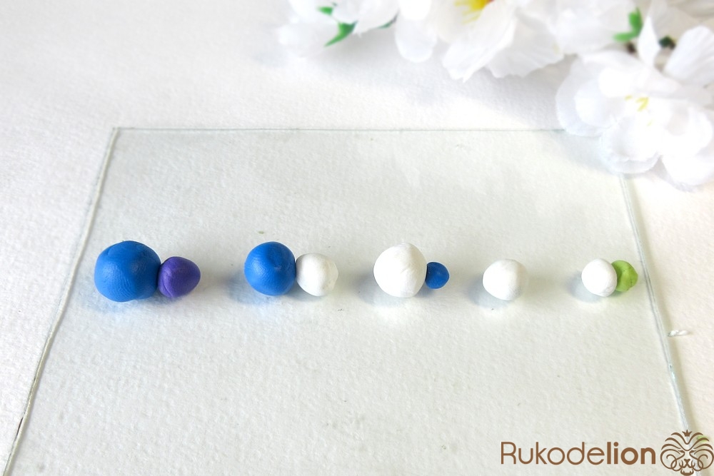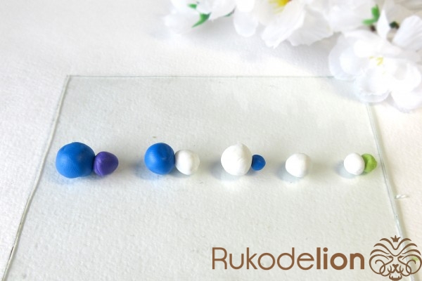 Пока стебли запекаются, можно подготовить подходящие оттенки глины для лепки соцветий. Для первого оттенка можно взять глину синего цвета, если нет синей, то можно взять голубую и небольшую часть фиолетовой. Для остальных оттенков берем голубую глину, белую, а также белую и зеленую в тех пропорциях, которые указаны на фото.