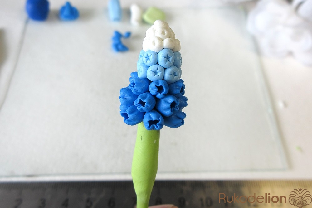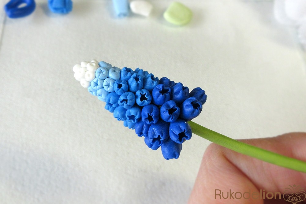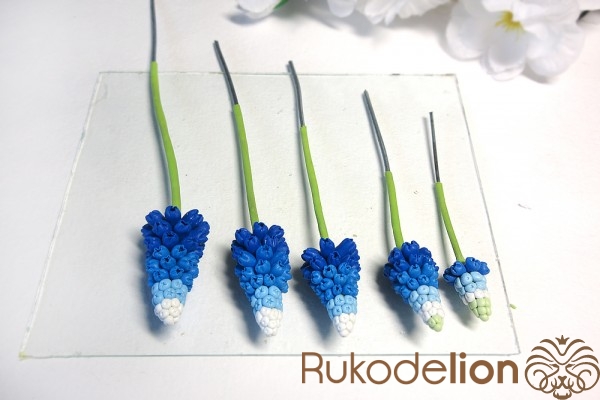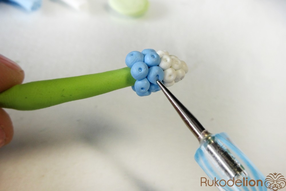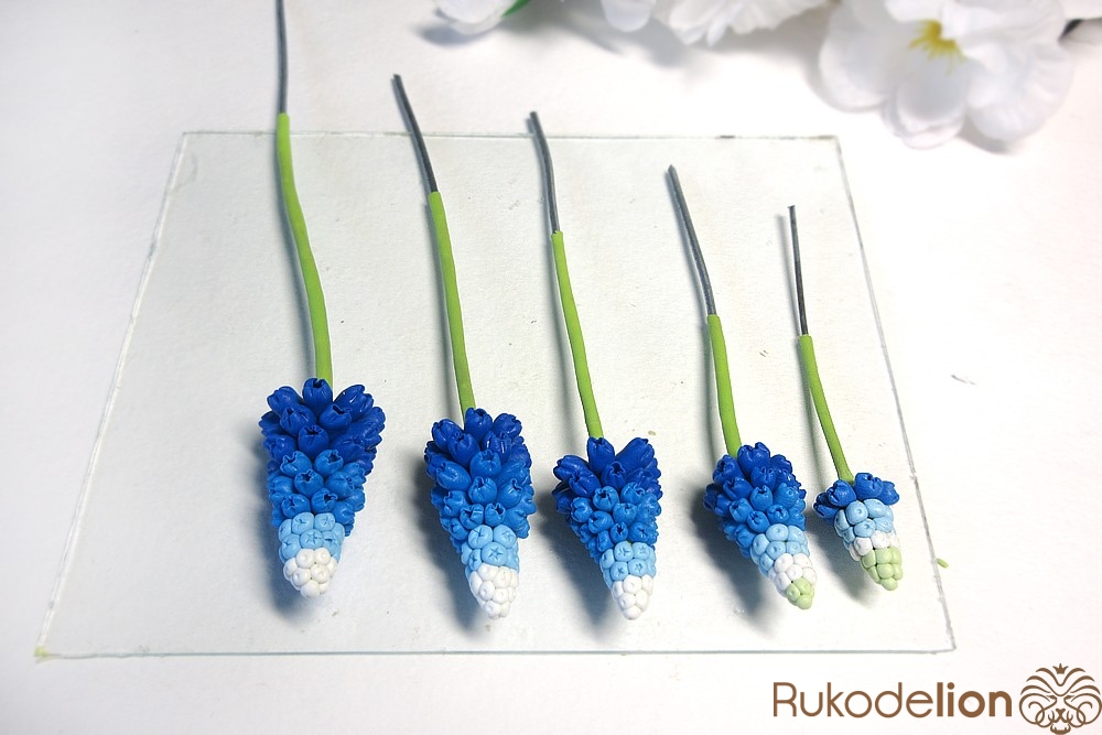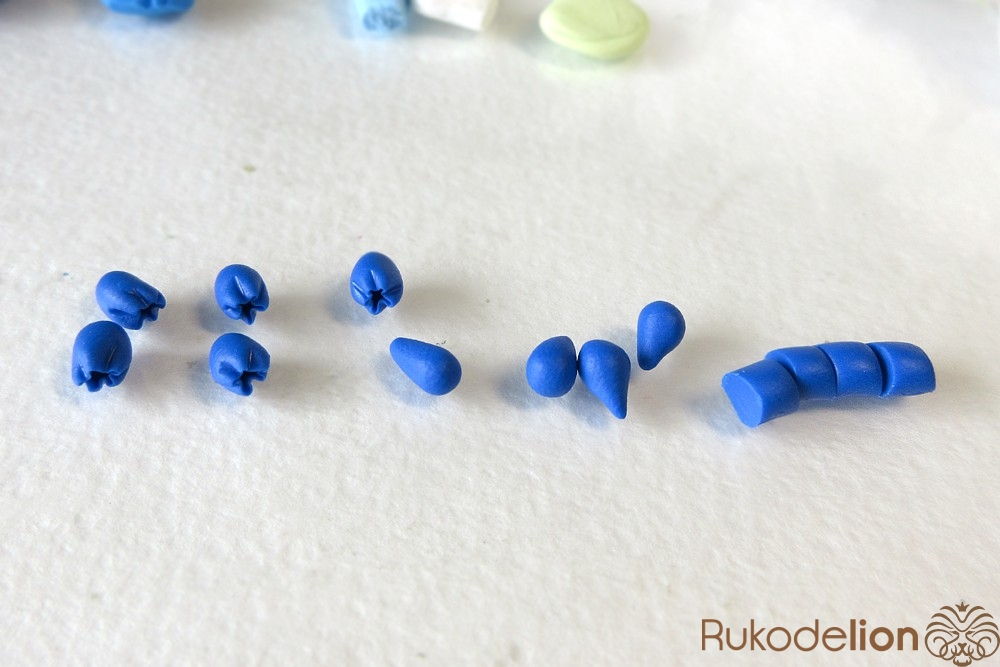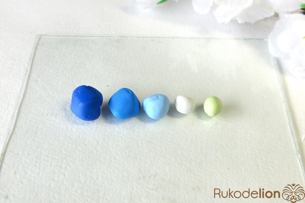 После смешивания кусочков глины у вас должны получиться вот такие оттенки. Если в палитре вашей глины уже есть подходящие готовые оттенки – можете брать их. В природе мускари бывают разных оттенков синего, голубого, фиолетово-голубого и даже белого цвета, поэтому не обязательно брать точно такие цвета, какие использовала я.
