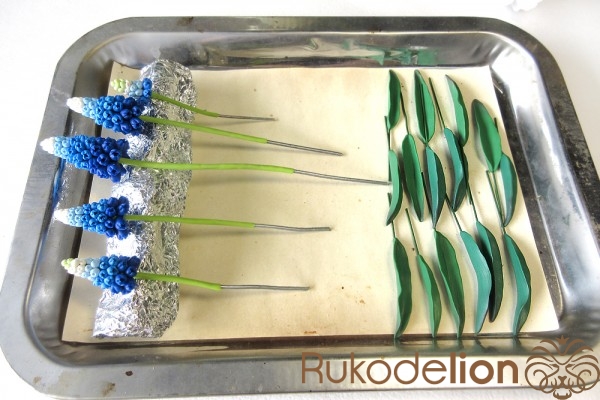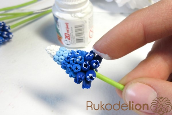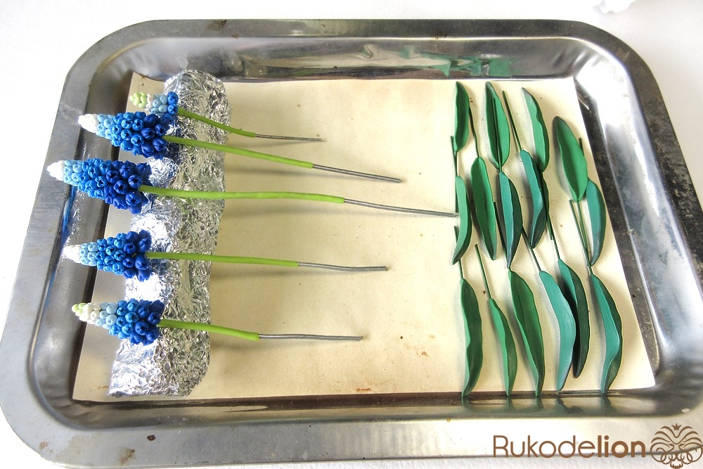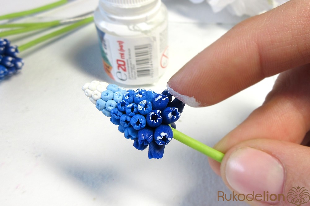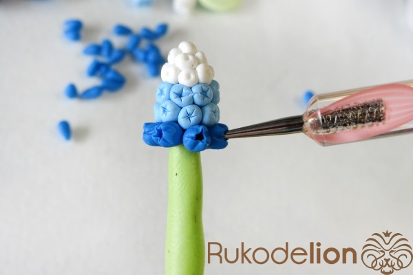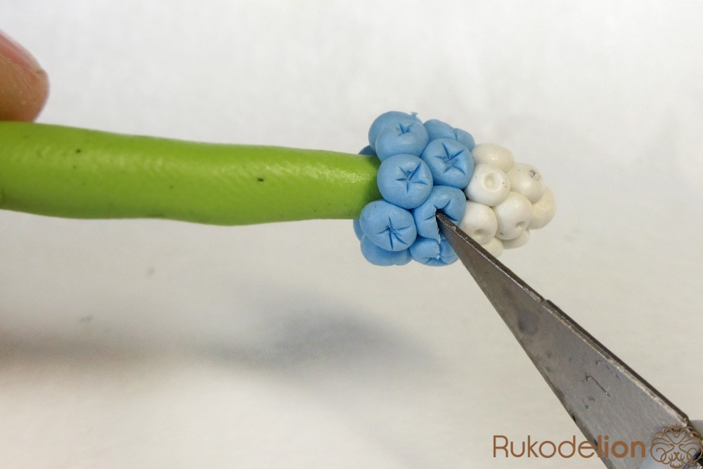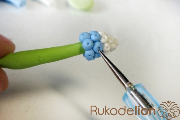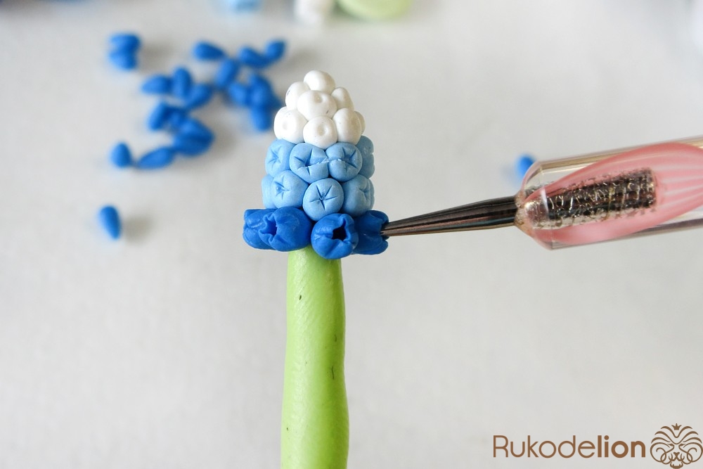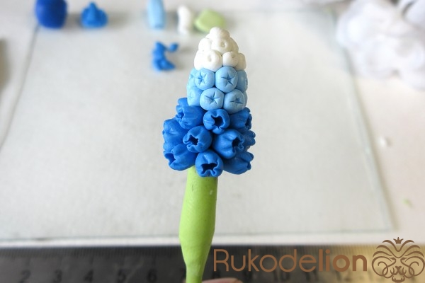 После смешивания кусочков глины у вас должны получиться вот такие оттенки. Если в палитре вашей глины уже есть подходящие готовые оттенки – можете брать их. В природе мускари бывают разных оттенков синего, голубого, фиолетово-голубого и даже белого цвета, поэтому не обязательно брать точно такие цвета, какие использовала я.