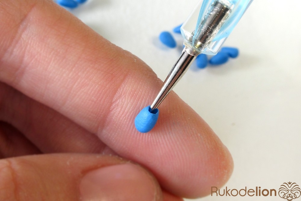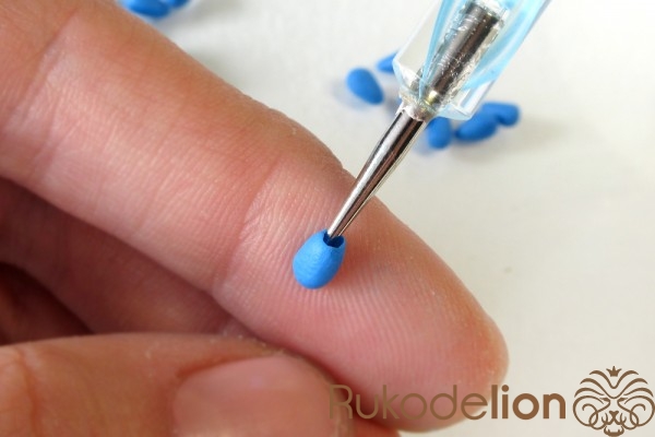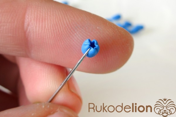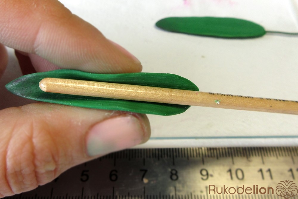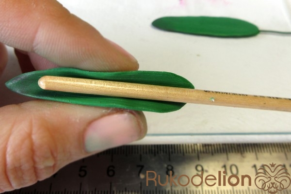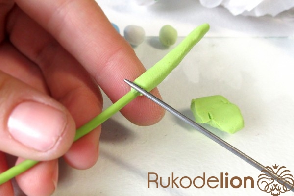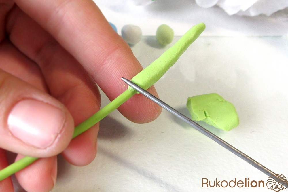 Теперь берем уже запеченный стебель, берем сырой кусочек той глины, которой облепляли стебли, и надеваем его на верхушку стебля. Нужно таким образом облепить слоем сырой глины верхушку стебля длиной 3-3,5см (в зависимости от размера цветка, который вы хотите сделать). Зубочисткой или стеком сглаживаем нижний край сырой глины, стараясь его примазать к стеблю.