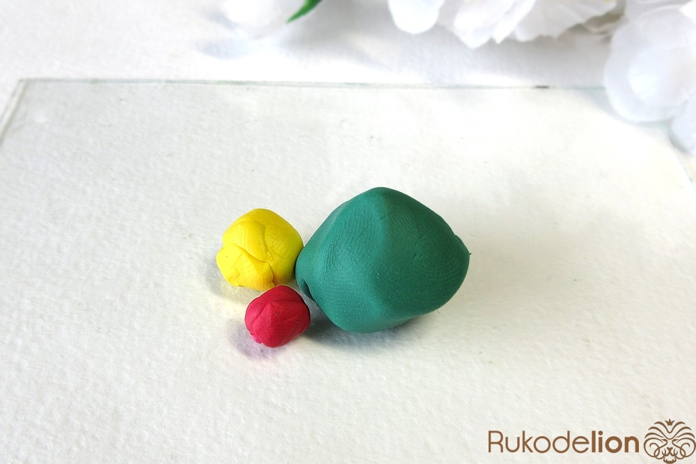 - запекаемая полимерная глина зеленого, желтого, светло-зеленого, белого, красного, синего цвета и полупрозрачная полимерная глина;