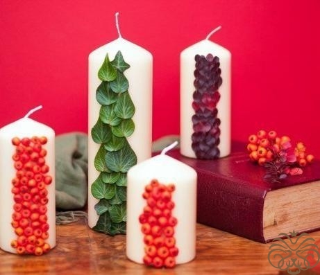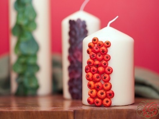 Осень - это время ярких красок природы и длинных ночей. В холодный осенний вечер зажгите свечу, которую мы украсим осенними листьями и плодами. Возвращаясь с прогулки, сорвите осенние крошечные ягоды и фрукты, а в магазине купите белые свечи. Для работы вам понадобятся: - различных размеров толстые белые свечи; - двусторонняя клейкая лента; - ножницы; - фрукты и ягоды.