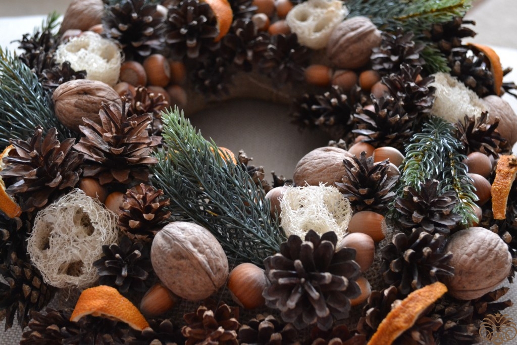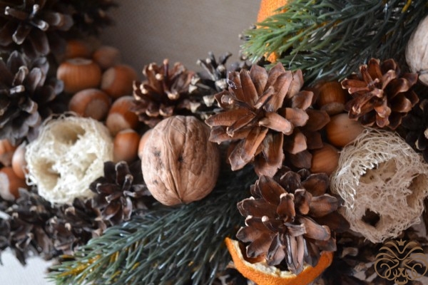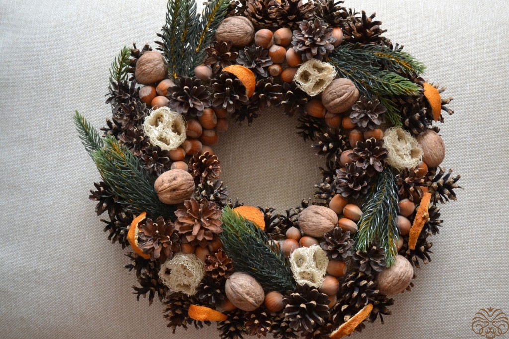 Искусственная ель, шишки, орехи, сушеный апельсин
