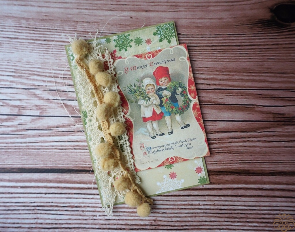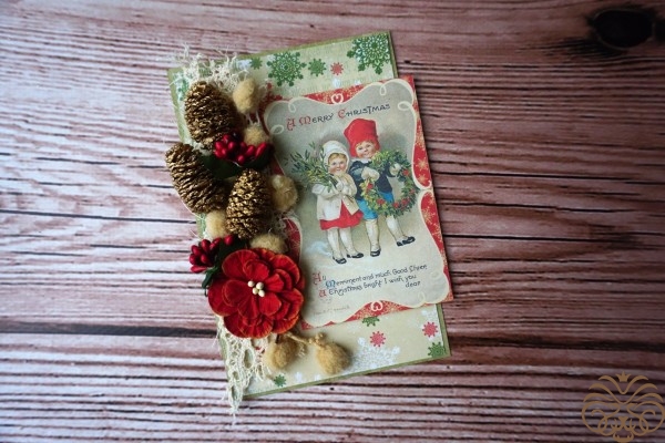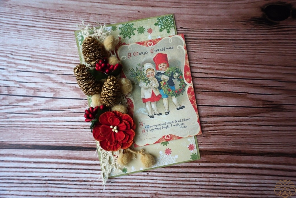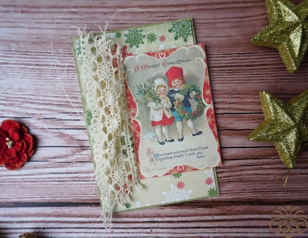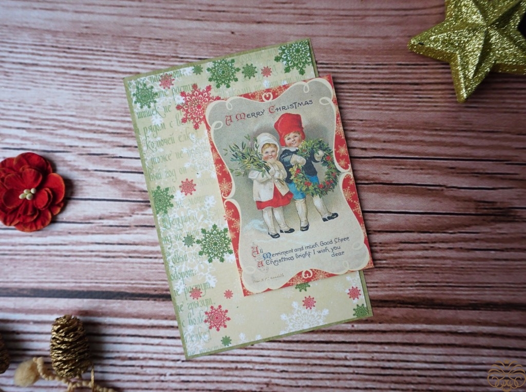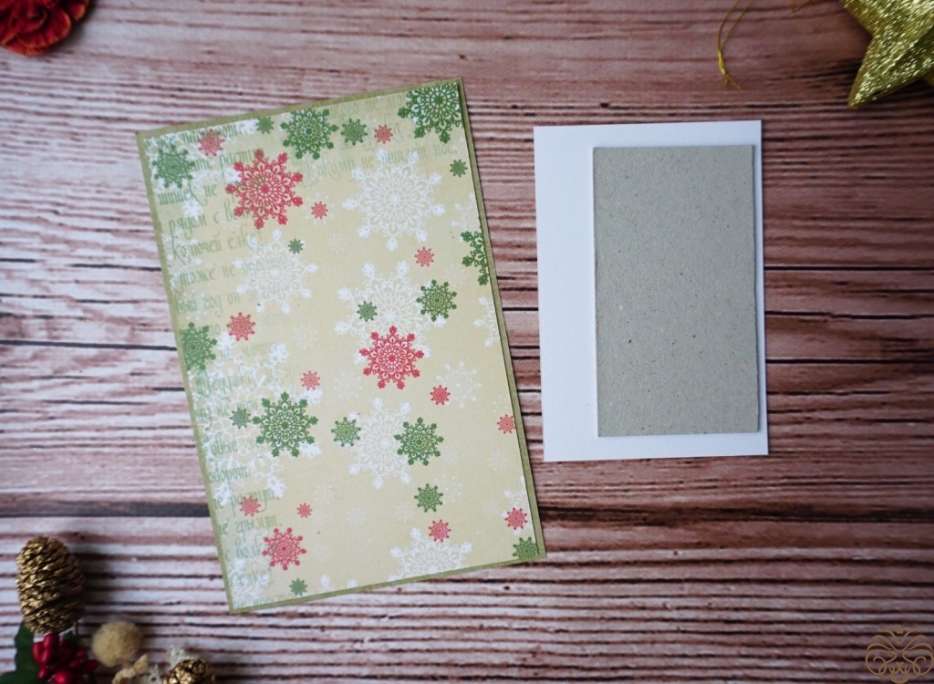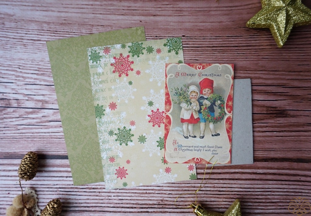 Я буду делать открытку в традиционных новогодних красно-зеленых тонах. Для основы я взяла два листочка из одной коллекции, один спокойной расцветки, другой с ярким принтом. Верхний слой необходимо сделать на пол сантиметра меньше нижнего. Также нам потребуется небольшая картинка в новогодней тематике, она должна быть в одной цветовой гамме с нашей основой.
