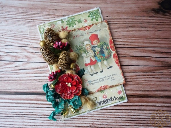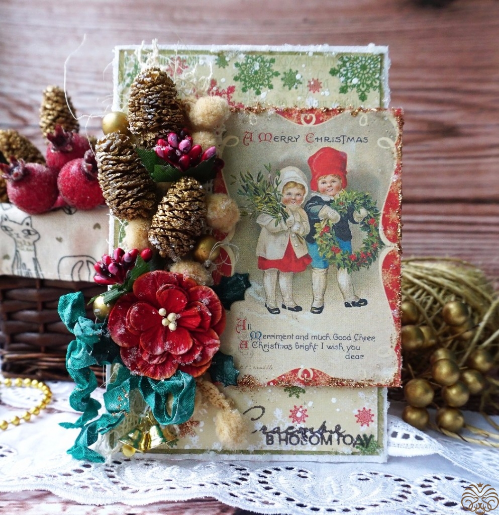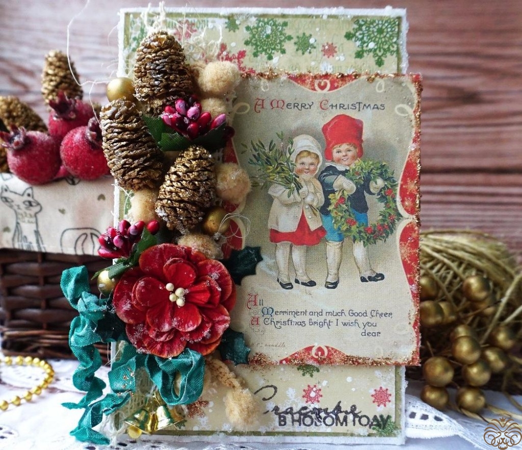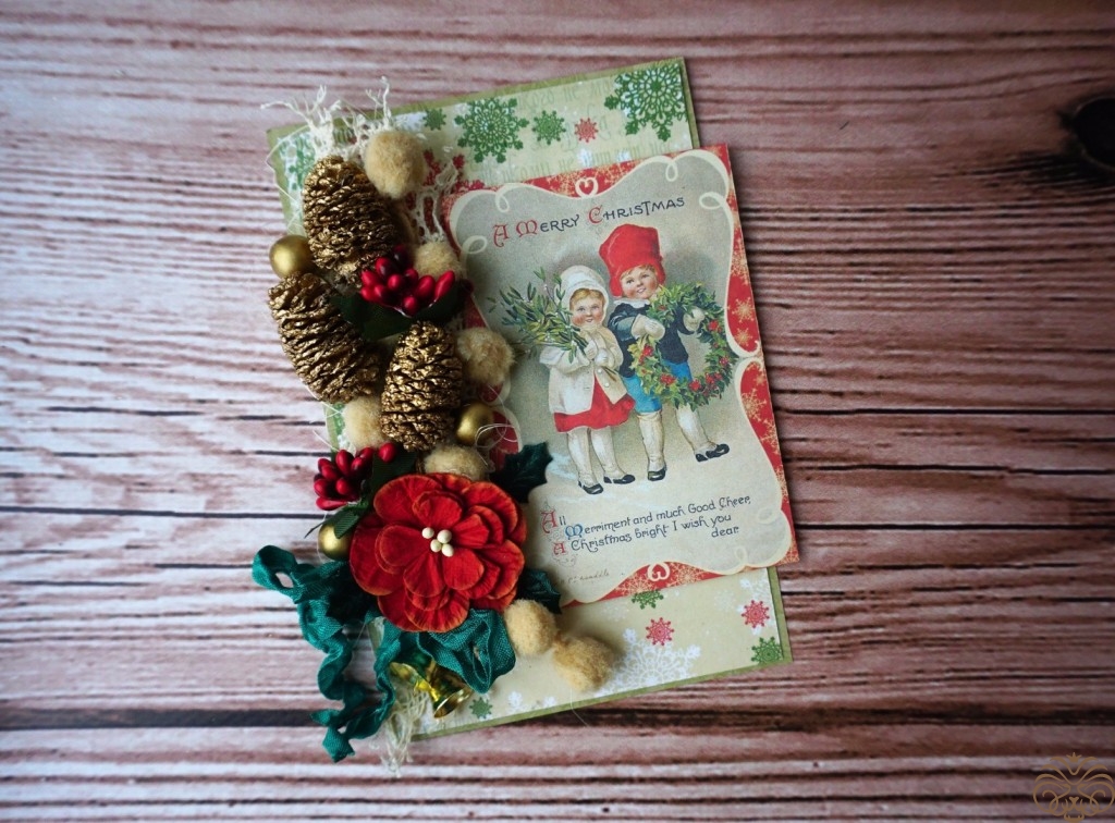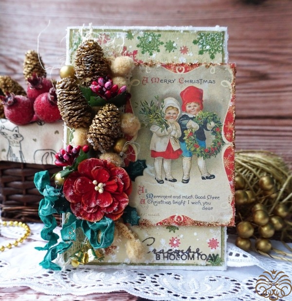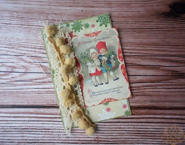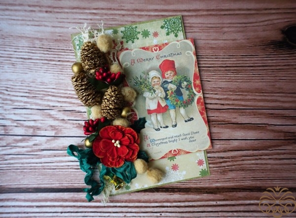 Я буду делать открытку в традиционных новогодних красно-зеленых тонах. Для основы я взяла два листочка из одной коллекции, один спокойной расцветки, другой с ярким принтом. Верхний слой необходимо сделать на пол сантиметра меньше нижнего. Также нам потребуется небольшая картинка в новогодней тематике, она должна быть в одной цветовой гамме с нашей основой.