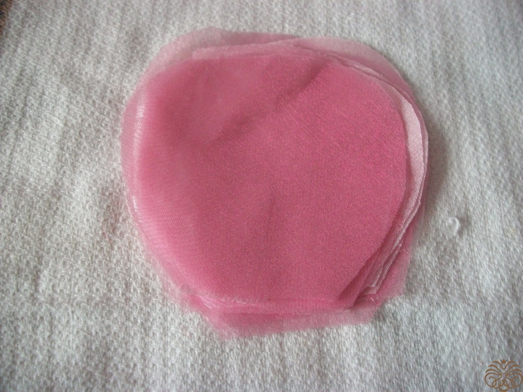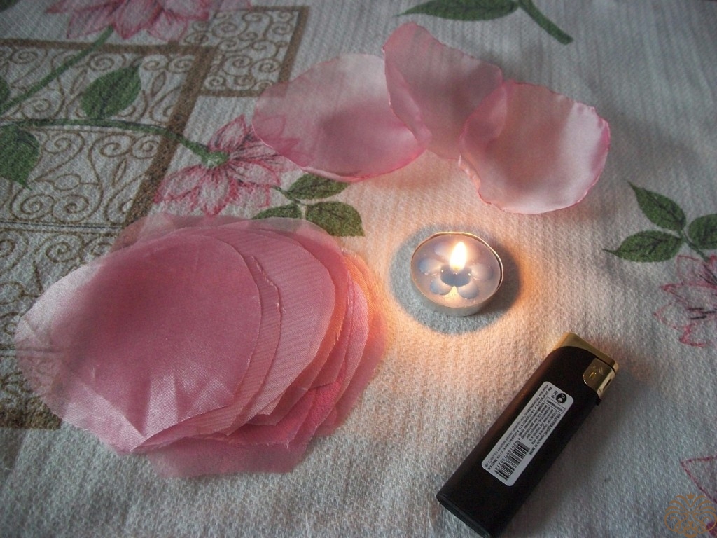 После того как все лепестки опалили, берем наше основание из плотной ткани и приклеиваем на него лепестки по кругу.Приклеиваем лепестки с нахлестом друг на друга. Когда все лепестки приклеены в серединку приклеиваем стразу.