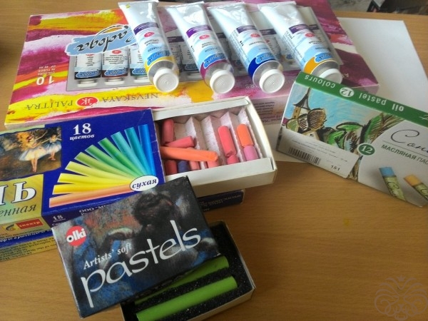 Берем пастель. Для начала сухую.  НО цвет у нее матовый и возможно сразу вам захочется взять и масляную пастель. Будьте осторожны выбирайте мягкую масляную пастель. Например Сонет вам НЕ подойдет.