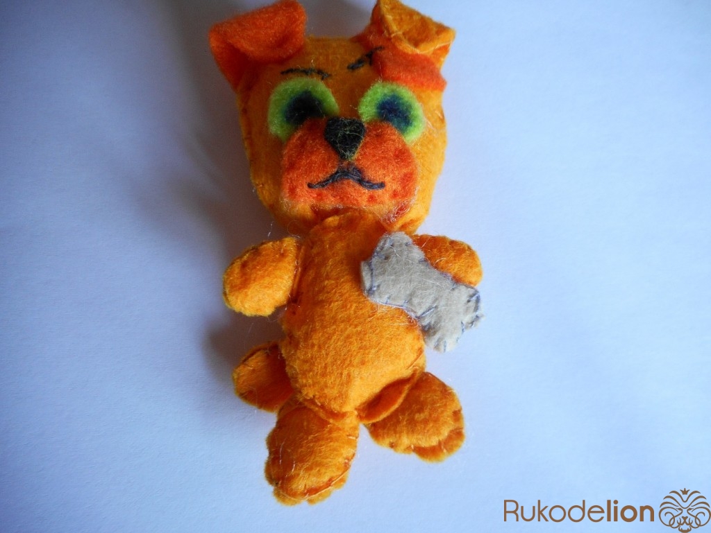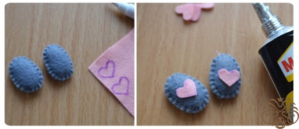 Теперь сделаем пяточки котика. На розовом фетре произвольно рисуем самоисчезающим маркером сердечки одинаковые по размеры. Вырезаем и приклеиваем их к нижним лапкам клеем Момент Кристалл