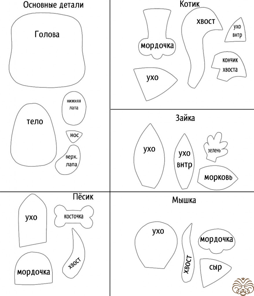 В каждом звере мы будем использовать основные детали из листа с выкройками, а также дополнительные детали в зависимости от животного. Т.е. чтобы сделать котика мы берем основные выкройки, а также выкройки под надписью "Котик". У всех животных основные детали одинаковые - меняется только цвет фетра, а вот изготовление головы немного отличается. В данном мастер классе я покажу подробно изготовление котика, а у остальных животных покажу те моменты изготовления, которые отличаются.