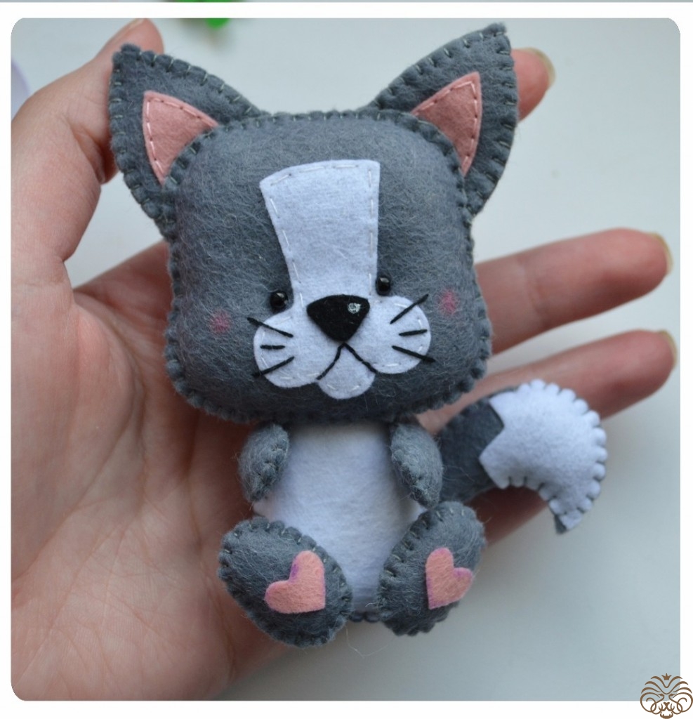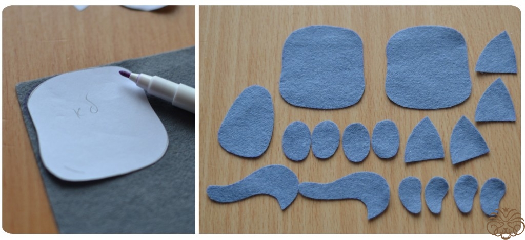 На сером фетре самоисчезающим маркером обводим следующие детали котика: голова 2 детали, хвост 2 детали, тело 1 деталь, нижняя лапа 4 детали, верхняя лапа 4 детали, ухо 4 детали. Вырезаем