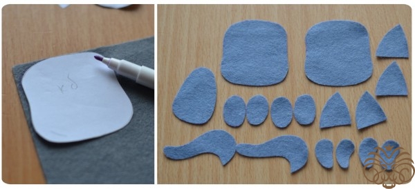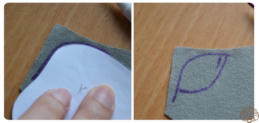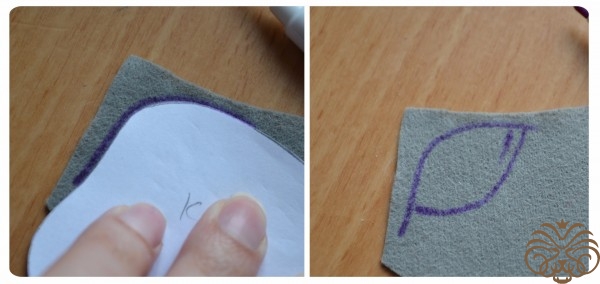 Также сделаем мышке пятнышко на голове. Для этого мы берем выкройку головы и обводим ее верхнюю левую часть на сером фетре. Затем убираем выкройку и от руки дорисуем пятнышко нужного нам размера. Вырезаем