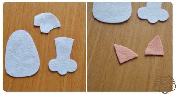 Чтобы сделать мышку мы вырезаем все детали из белого фетра. Только одно ушко у нас будет серое. Также у мышки другая форма мордочки. Её мы вырезаем из бежевого фетре (такая же мордочка будет и у зайки). Носик мы вырезаем из розового фетра, а не из черного, как у кота