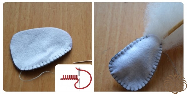 Сшиваем две детали головы обметочным швом и набиваем их синтепоном