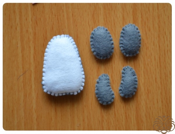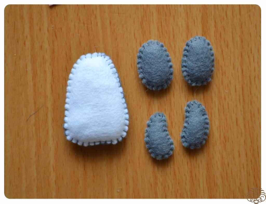 Начинаем сшивать детали. Соединяем белую и серую детали тела и сшиваем их обметочным швом. Оставляем небольшое отверстие для набивки. Набиваем тельце синтепоном и заканчиваем обметочный шов