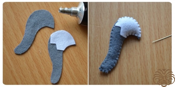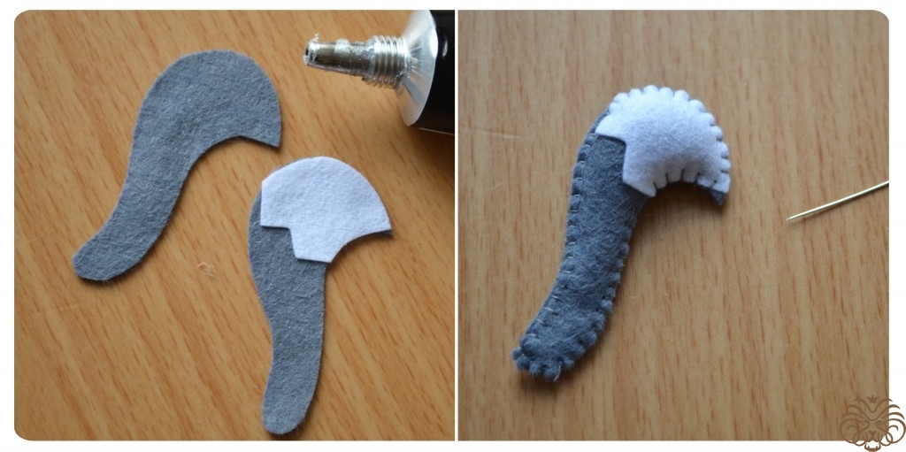 Приклеиваем белый кончик на хвостик клеем Момент Кристалл или любым текстильным клеем. Я ставлю совсем маленькую каплю клея, только для того, чтобы зафиксировать белую деталь для удобства пришивания. Затем обшиваем весь хвост обметочным швом и набиваем его синтепоном