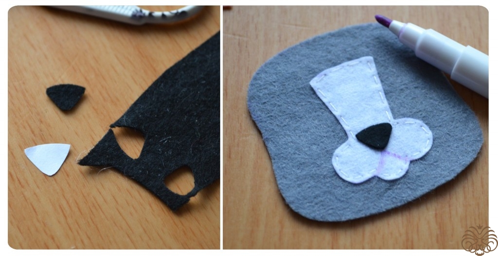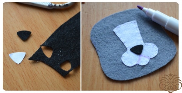 На черном фетре мелком или кусочком мыла обводим выкройку носика кота. Вырезаем*. Приклеиваем носик на мордочку клеем Момент Кристалл. Самоисчезающим маркером рисуем будущие очертания ротика