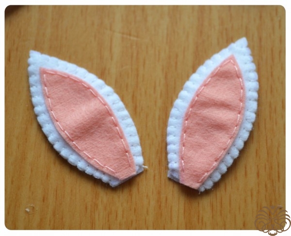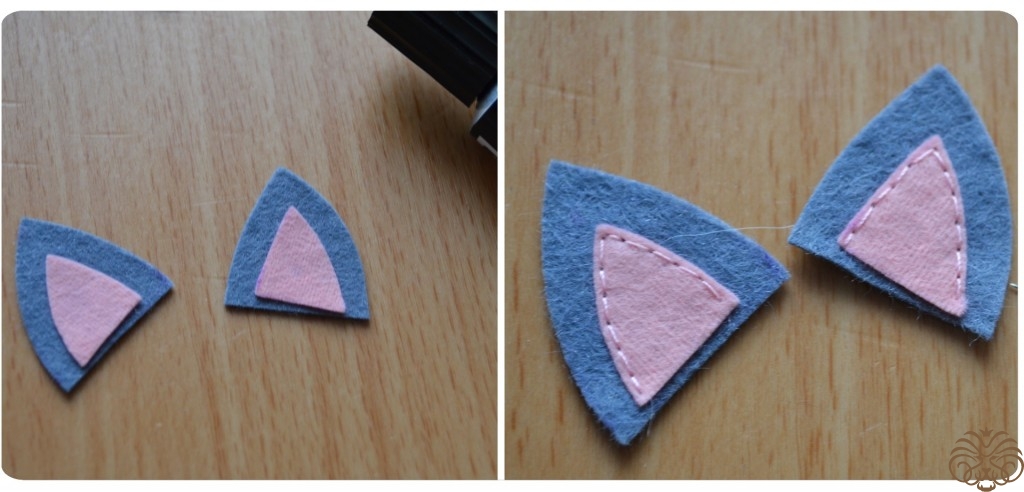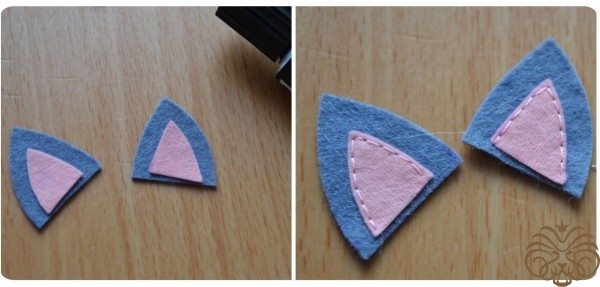 Пришиваем розовые внутренние части ушек к серым деталям швом "назад иголка". Для удобства мы можем сначала закрепить розовые детали к серым клеем Момент Кристалл