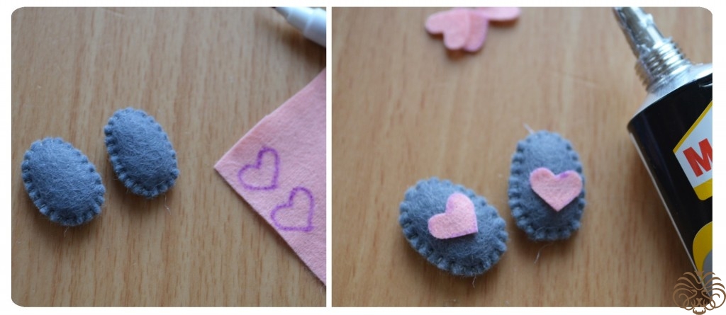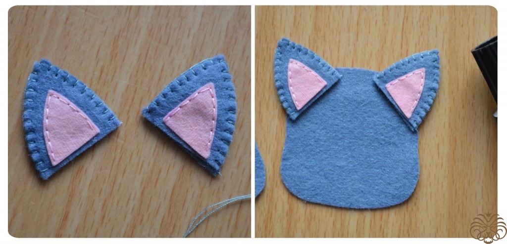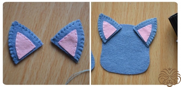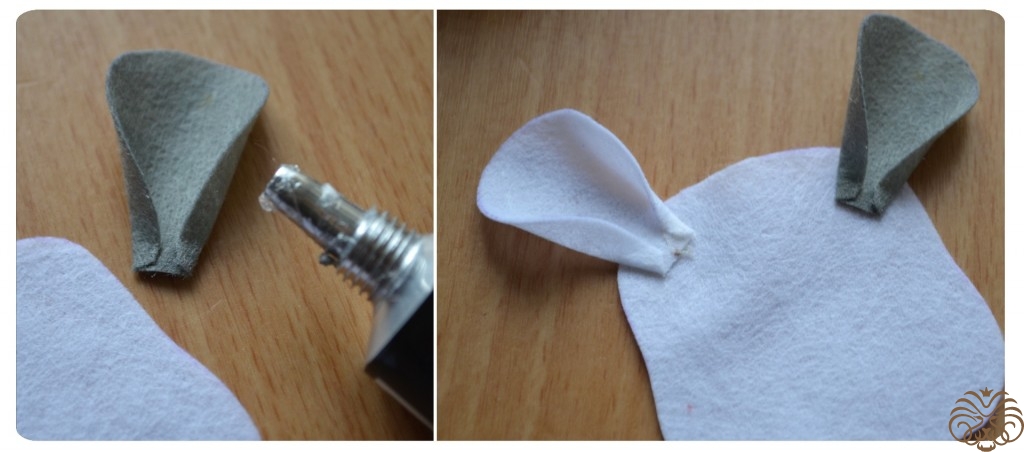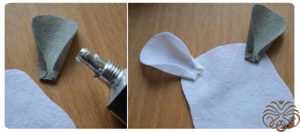 Сшиваем ушки обметочным швом с их вторыми вырезанными деталями. Берем вторую серую деталь головы (та, на которой нет пришитой мордочки) и фиксируем на ней наши готовые ушки (нам нужно поставить две маленькие капли клея, только для удобства пришивания)
