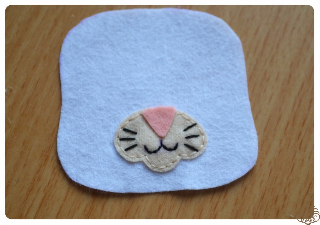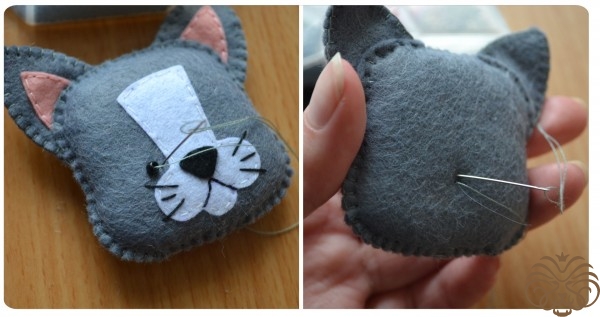 Черными двойнами нитками вышиваем ротик кота швом "назад иголка". Также вышиваем ему усики