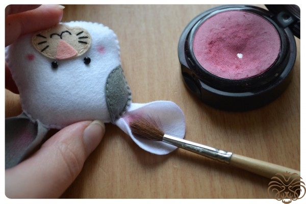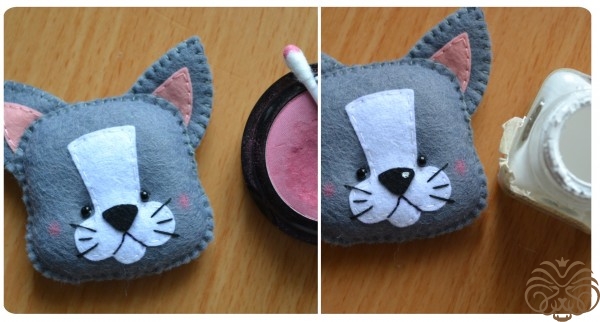 Румянами нарисуем котику щечки. Белой краской по ткани нарисуем на носике блеск. Спустя некоторое время часть краски впитается в фетр и нужно будет нанести второй слой краски и оставить до полного высыхания