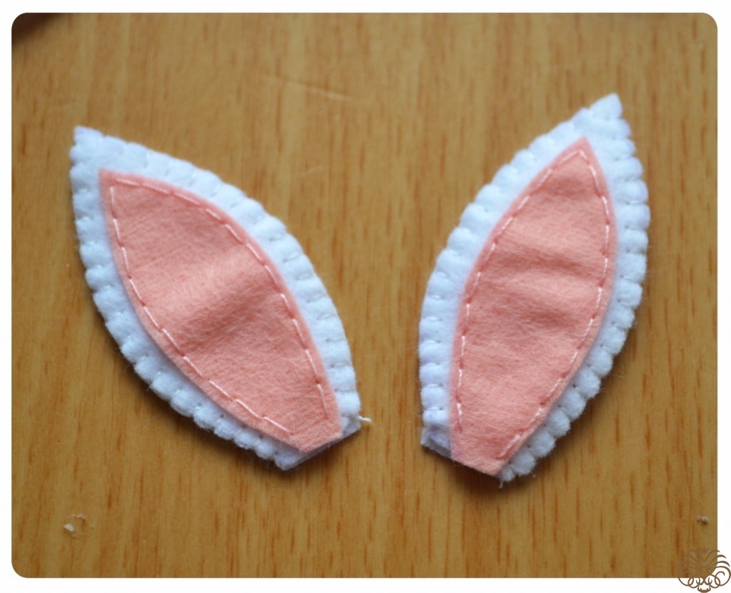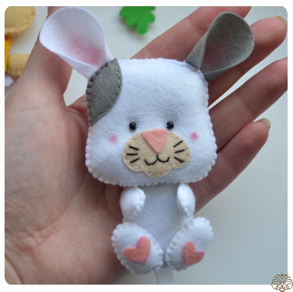 У зайки мордочка такая же как у мышки, только вышивку делаем не черными нитками, а розовыми. Ушки делаются точно также как у котика, отличаются они только формой. Вместо хвостика зайке можно приклеить помпон. Все остальные детали вырезаются тоже из белого фетра