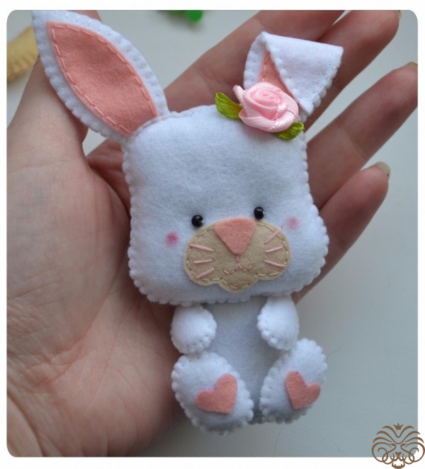 Когда будете склеивать детали зайки, загните одного его ушко. Для этого поставьте каплю горячего клея по середине уха и сделайте изгиб. Также я добавила зайке цветочек, т.к. весь зайка делается из белого фетра, и он мне показался бледноватым