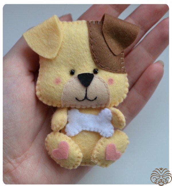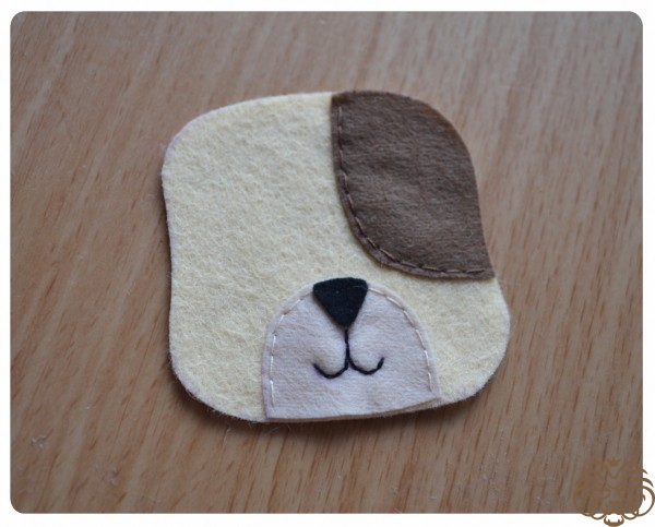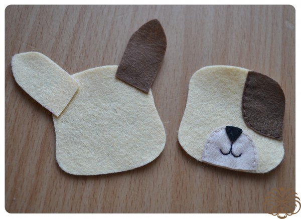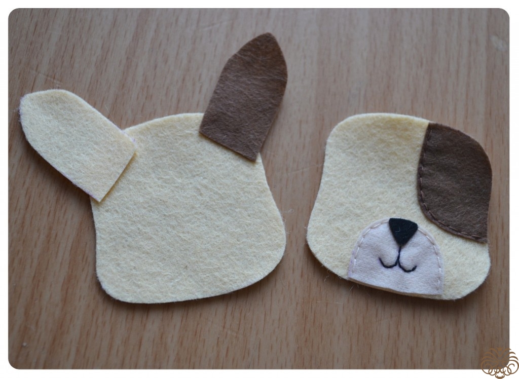 У собачки немного другой формы мордочка. Также сделаем ей пятнышко на голове, как мы делали у мышки. Все остальные детали вырезаются из бежевого фетра и одно ушко мы сделаем коричневое
