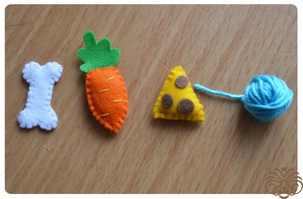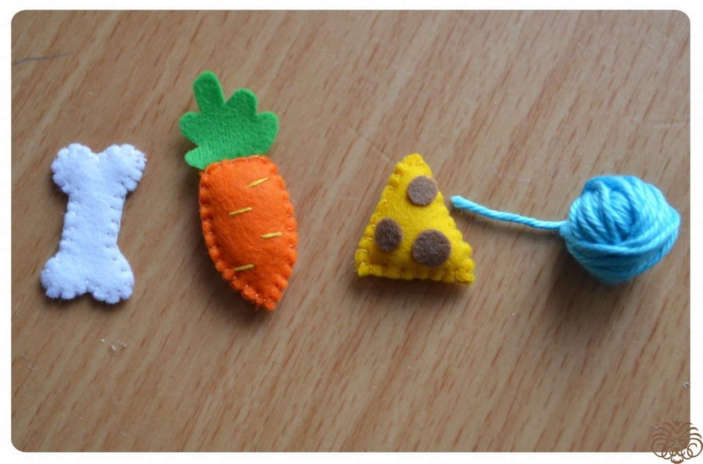 Я решила сделать всем животным по аксессуару в лапки. Для котика из голубой пряжи сматываем клубочек. Для мышки сделаем кусочек сыра. Для этого из желтого фетра по выкройке вырезаем две детали сыра. Сшиваем их обметочным швом, набиваем синтепоном. Из коричневого фетра вырезаем произвольной формы кругляшки (дырочки сыра) и приклеиваем их момент Кристаллом. Чтобы сделать морковку для зайки вырезаем две детали морковки из рыжего фетра. На одной из них швом "назад иголка" желтыми нитками нарисуем штрихи. К нижней рыжей детали приклеиваем вырезанную из зеленого фетра зеленушку  и сшиваем детали обметочным швом, набиваем синтепоном. Косточку для собаки вырезаем из белого фетра и обшиваем обметочным швом. Косточку я не стала набивать синтепоном