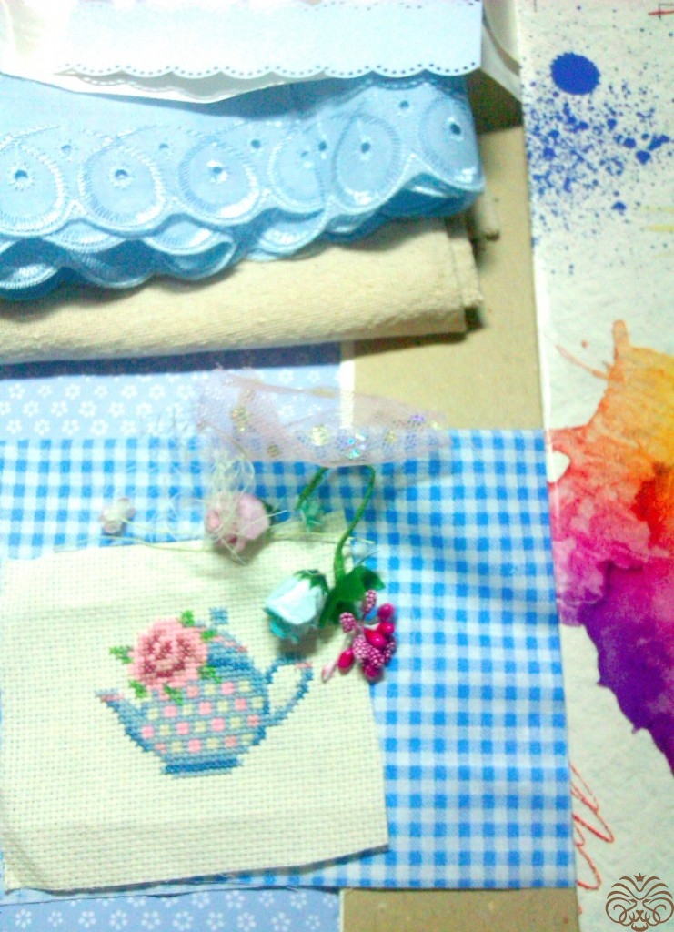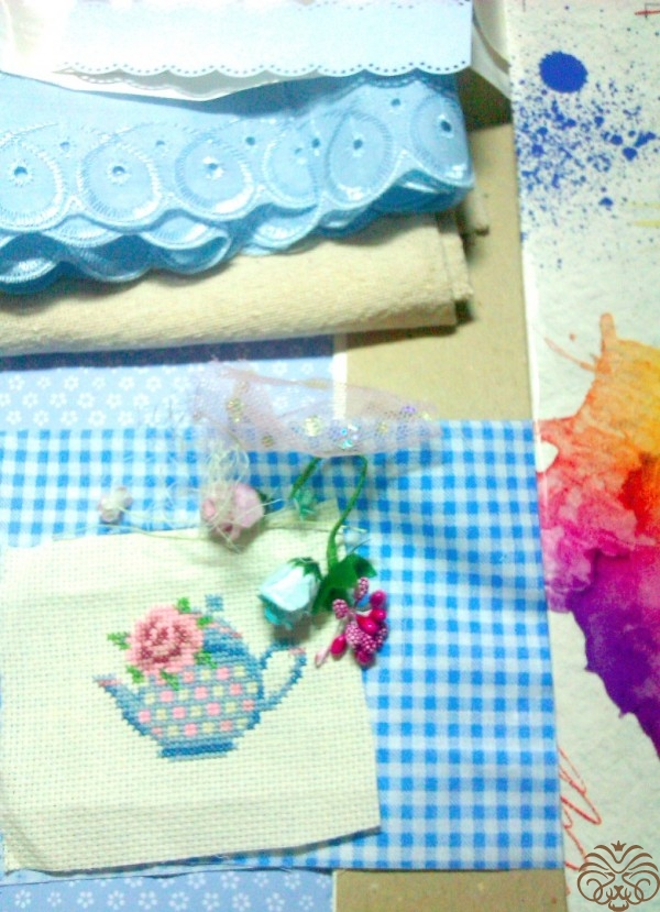 Приклеиваем голубое шитье. Ставим уголки при помощи плоскогубцев и мягкой тряпочки, но можно обойтись и без них. Раскладываем весь декор, примеряем. И начинаем приклеивать: