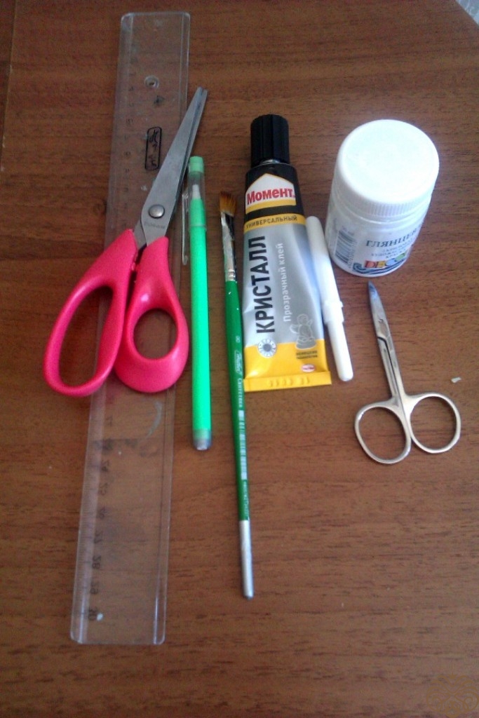 Инструменты простые: ножницы простые и маникюрные, клей прозрачный, кисточка с акриловой белой краской, карандаш, ластик, линейка, штемпельная подушечка коричневого цвета.  Для установки уголков: уголки, плоскогубцы, мягкая тряпочка. Еще понадобится швейная машинка, если есть.