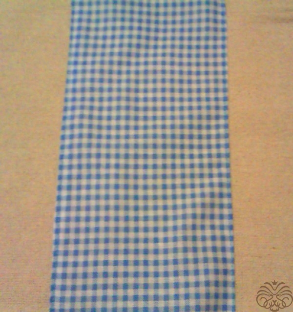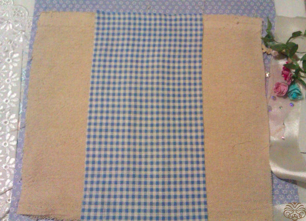 Раскладываем обложку на отрезе льняной ткани. Он больше по размеру, чем сама обложка. Делаем добавляем по сантиметру-полтора с каждой стороны на подгиб. Прикладываем посередине лоскут голубой ткани.  Подгибаем края голубой ткани, пристрачиваем.
