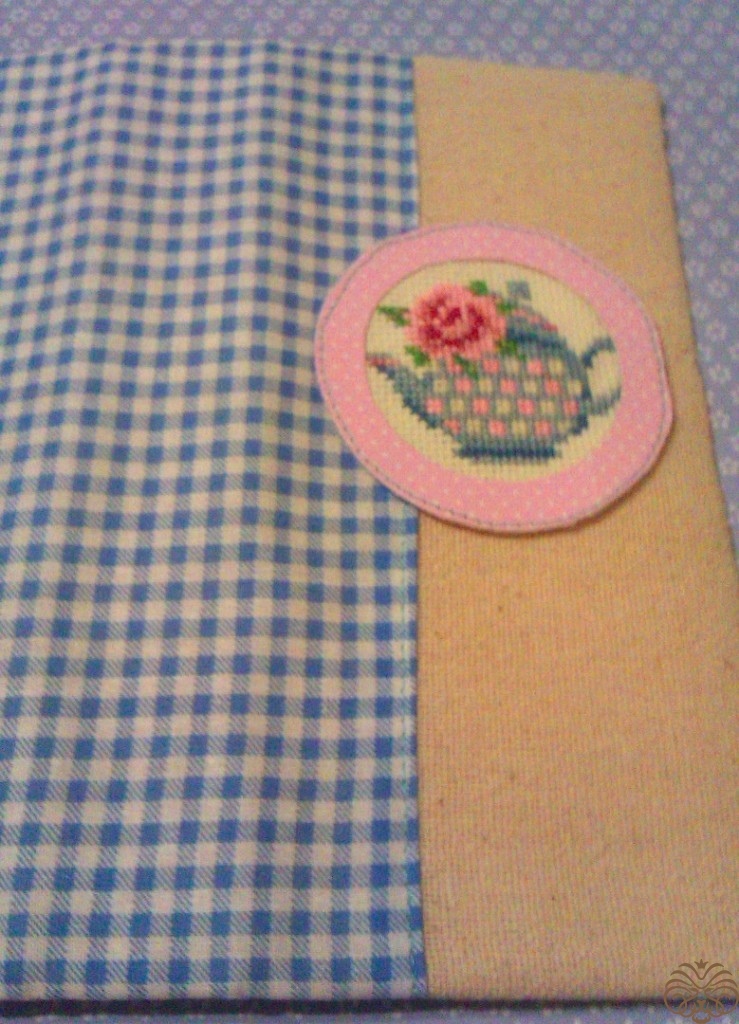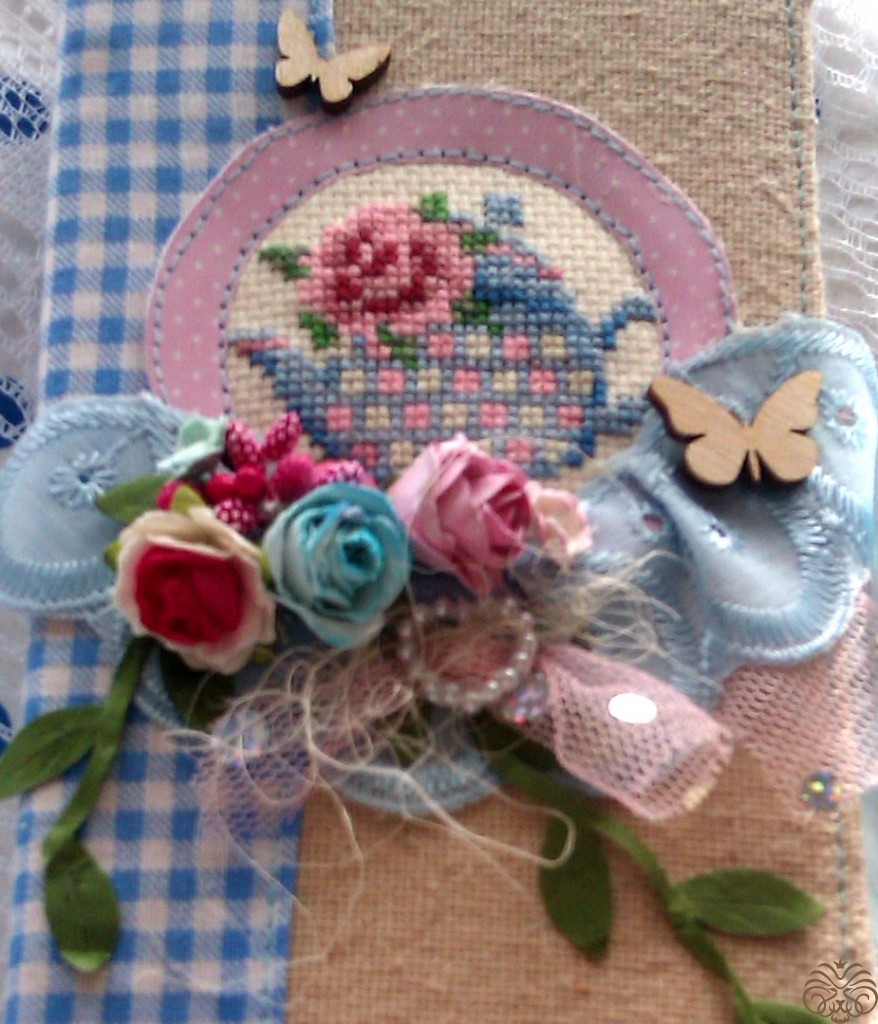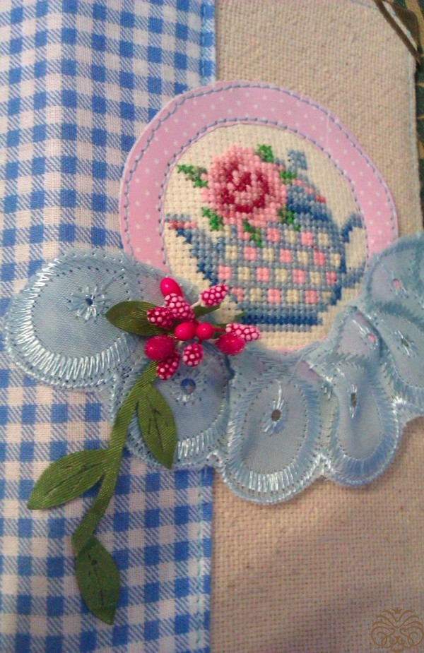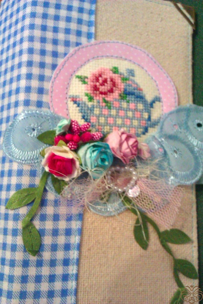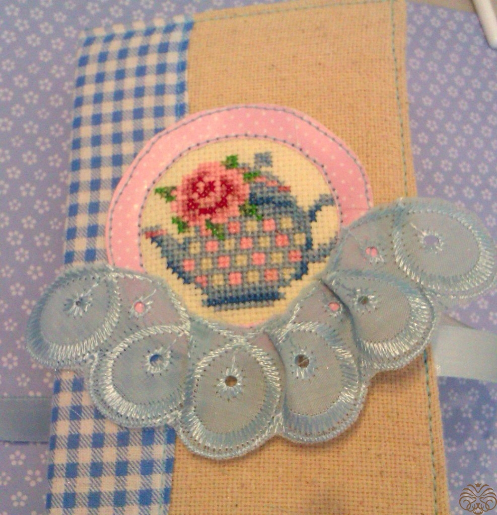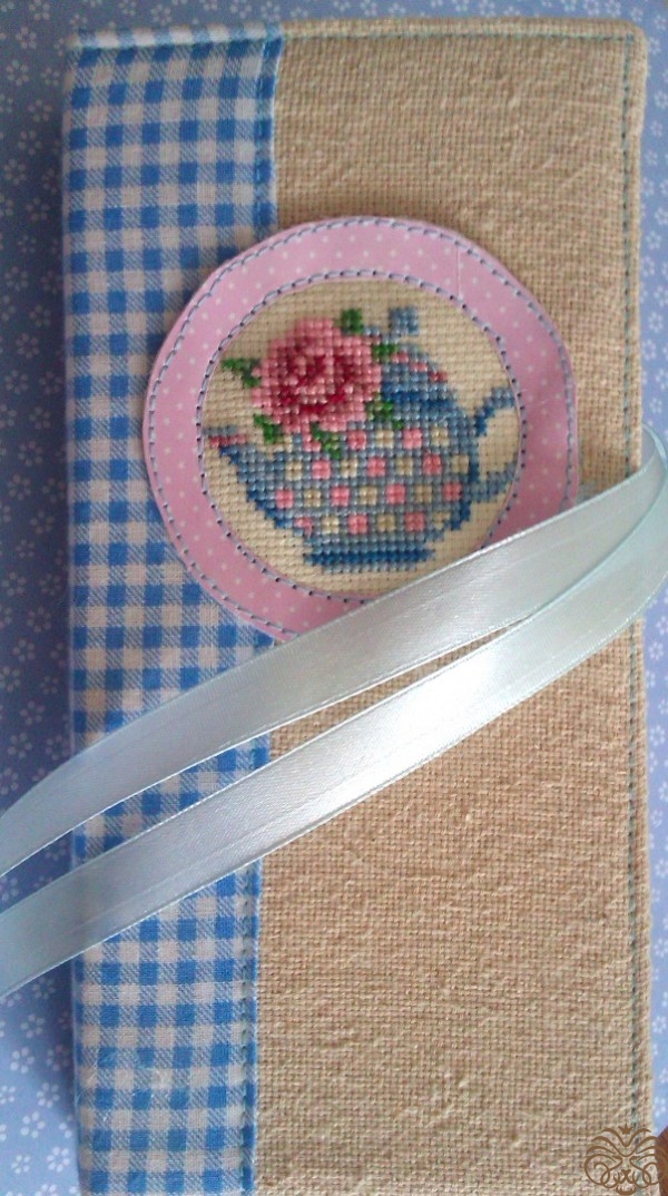 Края ленточки обрабатываем,примеряем и  приклеиваем. Дальше всю обложку я прошиваю по периметру, прихватывая и завязки. Переворачиваем и по внутреннему кругу пришиваем рамочку с вышивкой.  Почему так? У нас остается небольшой кармашек у края рамочки, который мы используем для декорирования и спрячем туда некрасивые хвостики.