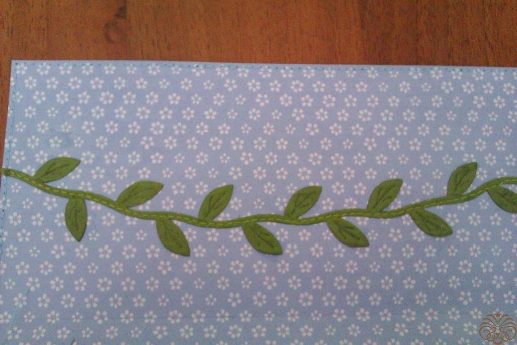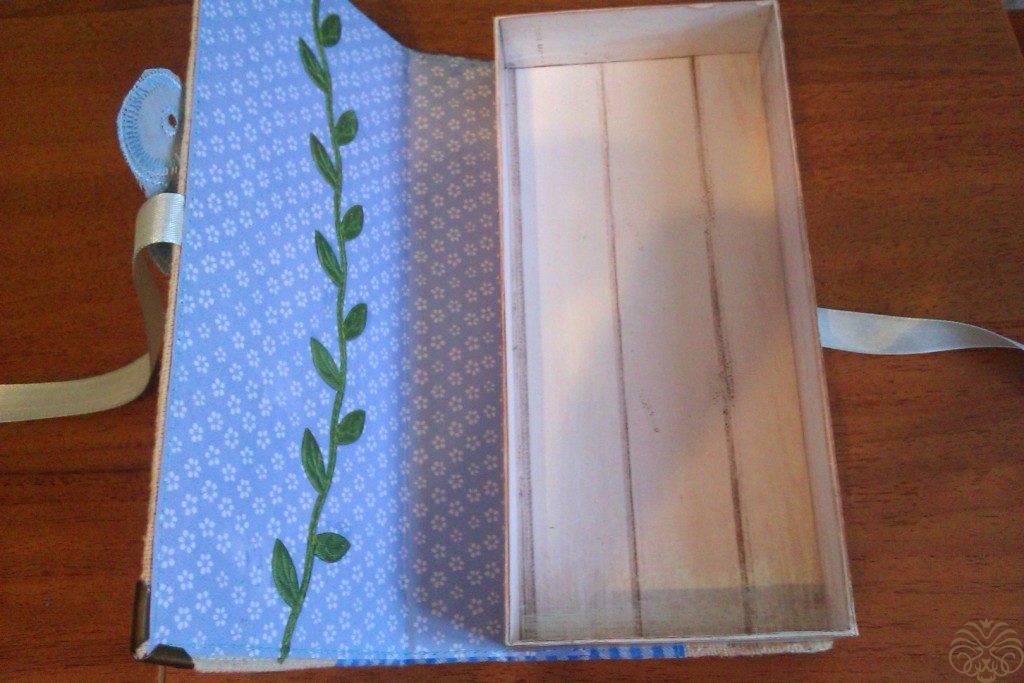 Вырезаем прямоугольник из скрапбумаги. Это наш будущий форзац. С трех сторон он на пару миллиметров меньше обложки, а там где бумага заходит под коробочку, оставлен небольшой хвост. Размеры: 20,4*15 см. Линии биговки через 9,4 см, следующая через 12,8 см. Бигуем, складываем по линиям биговки. По трем сторонам прокладываем машинную строчку. Отрезаем фрагмент тесьмы с листочками и полукругом пристрачиваем к форзацу. Приклеиваем форзац: сначала корешок, затем меньшая сторона,, затем самая большая. Если что-то плохо приклеивалось на "Момент", я подклеивала на суперклей. Тщательно все приглаживаем. Опять оставляем сушиться. Немного погодя ставим уголки при помощи плоскогубцев и мягкой тряпочки, но можно обойтись и без них.