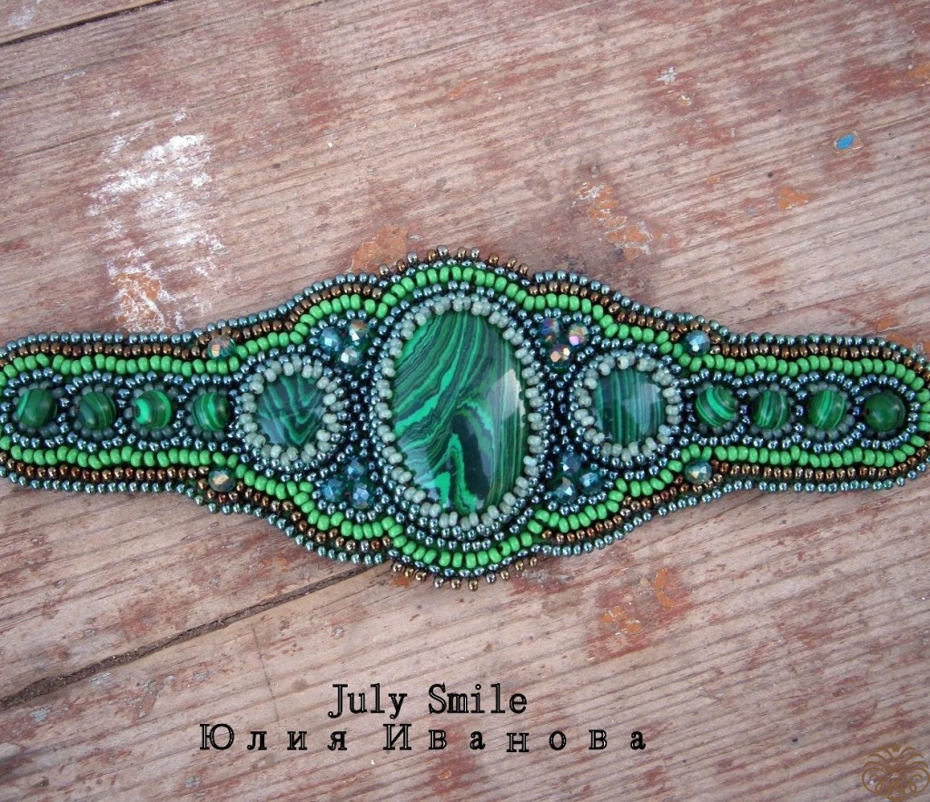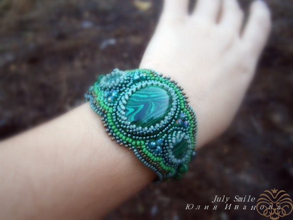 Браслет с малахитом в технике вышивка бисером в приятных зеленых оттенках