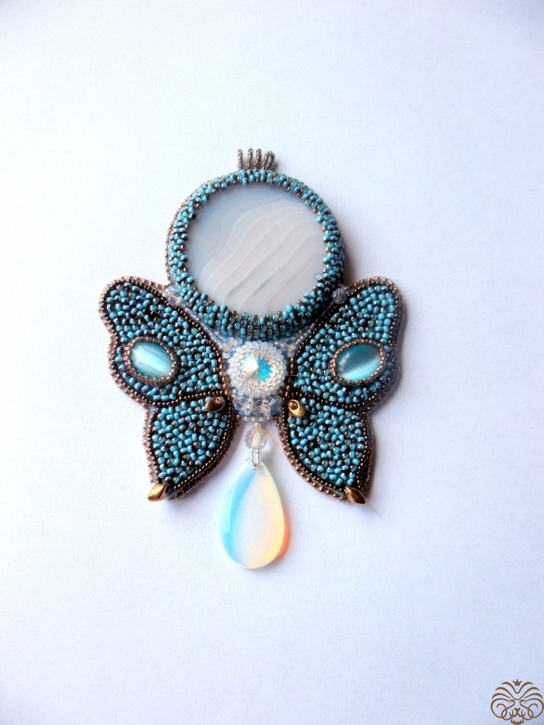 Материалы: бисер Cotobe, бисер Toho, кабошон агата, риволи Swarovski, кабошоны кошачьего глаза (имитация), капелька лунного камня, бусины, натуральная кожа бежевого цвета.