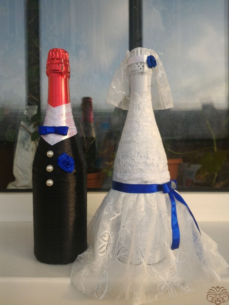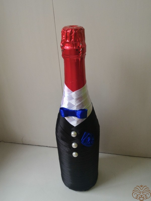 Берем бутылку шампанского и обматываем ее атласной лентой, под углом (на фото видно)