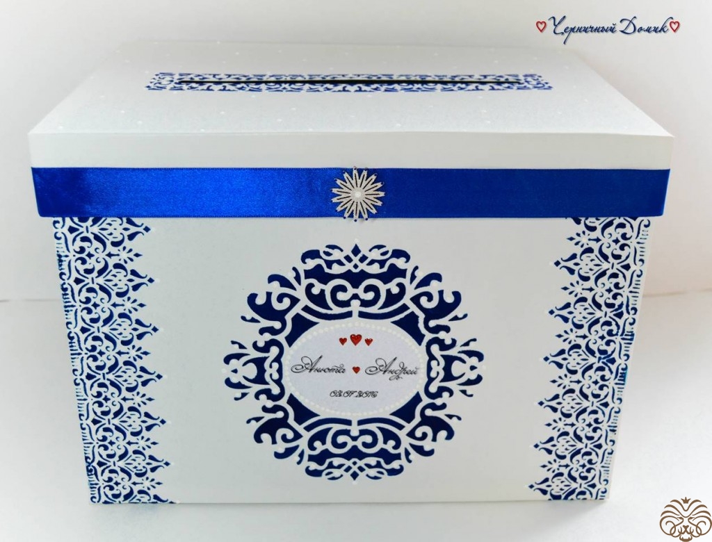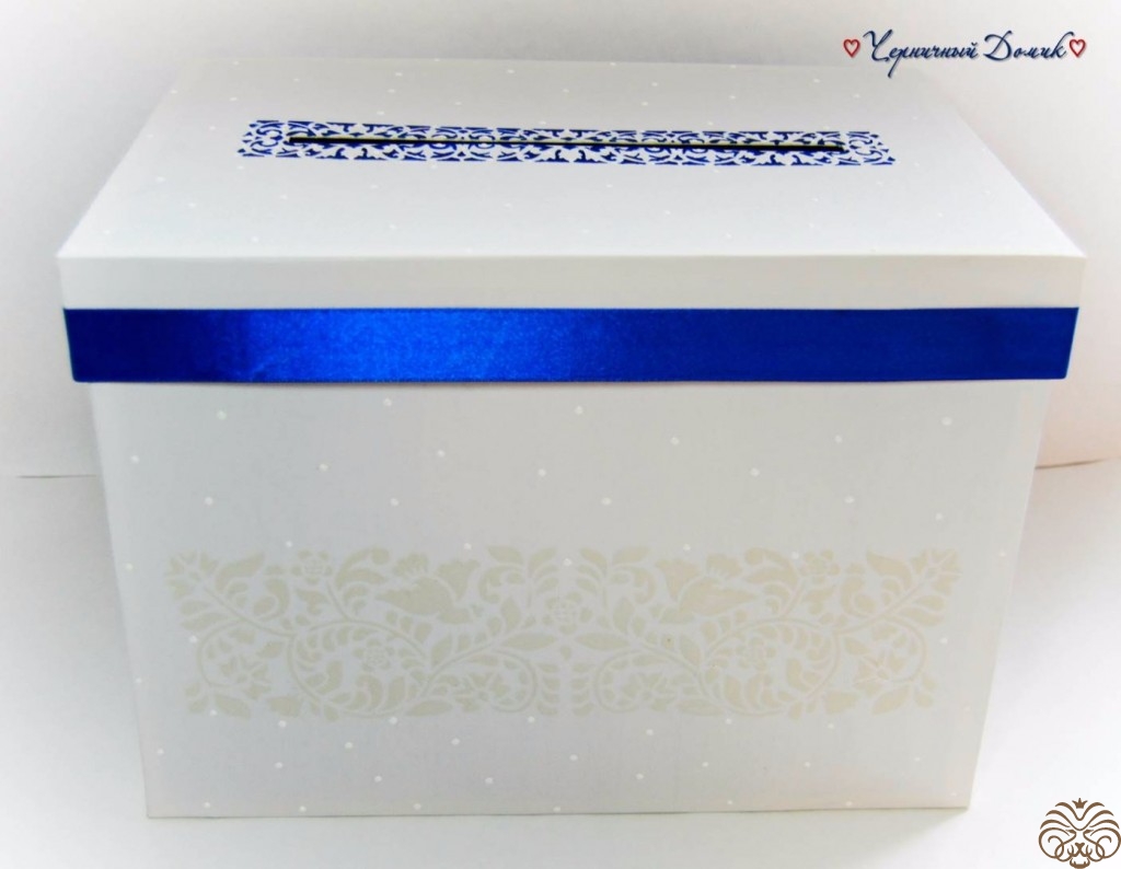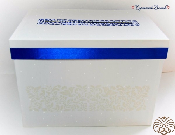 Казна выполнена из плотного картона, декорирована атласными лентами, акриловыми красками, контурами, а так же объемными узорами.
