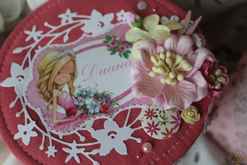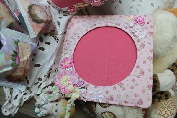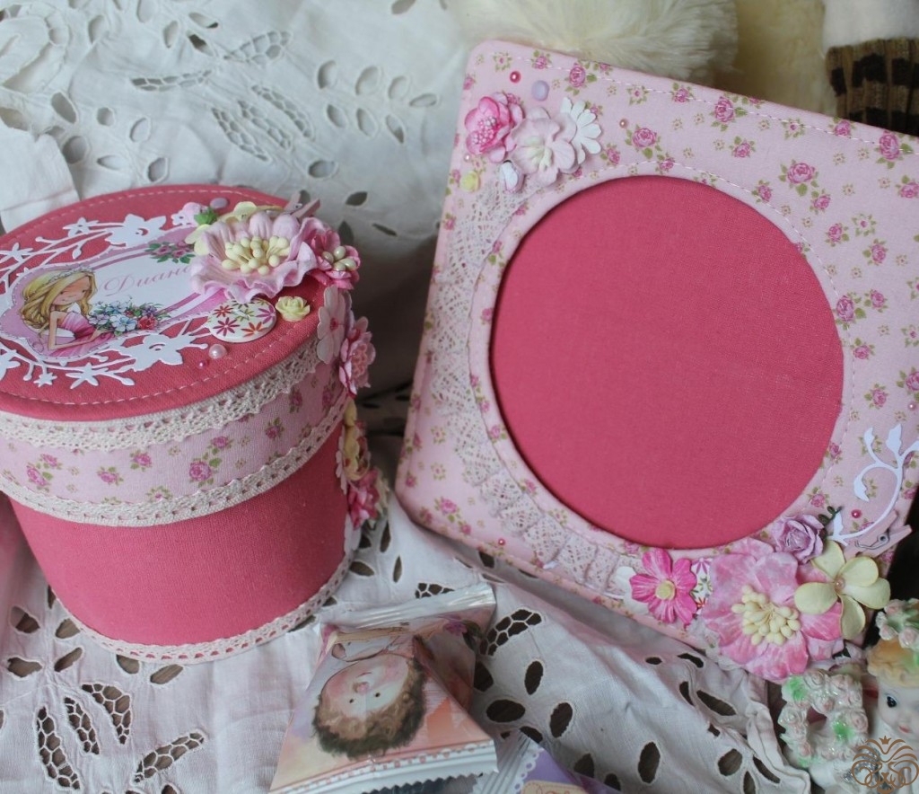 Подарок для маленькой принцессы. Круглая коробочка для детских украшений и мягкая рамочка для фото. Обтянуты тканью, украшены цветами.