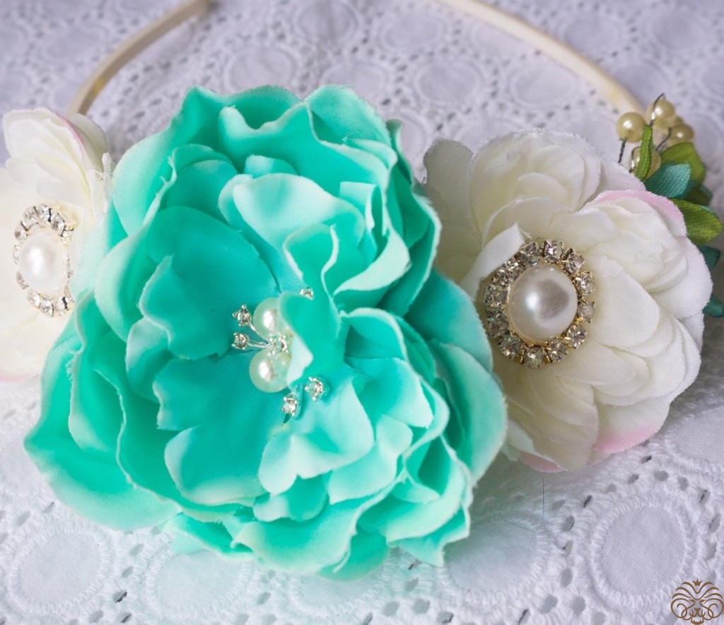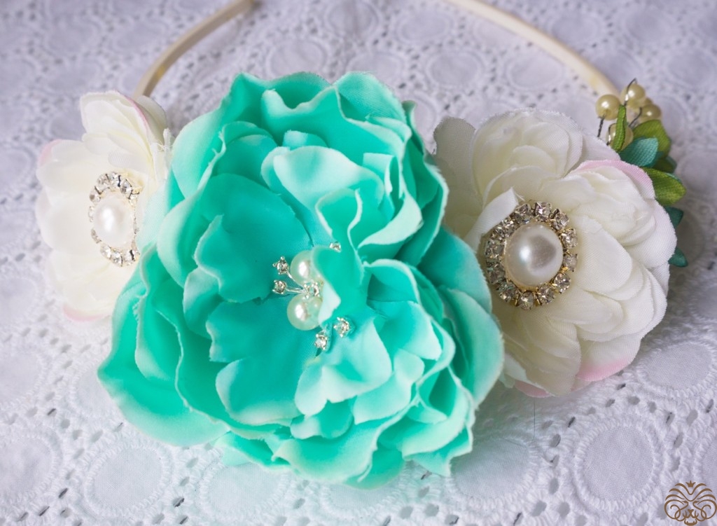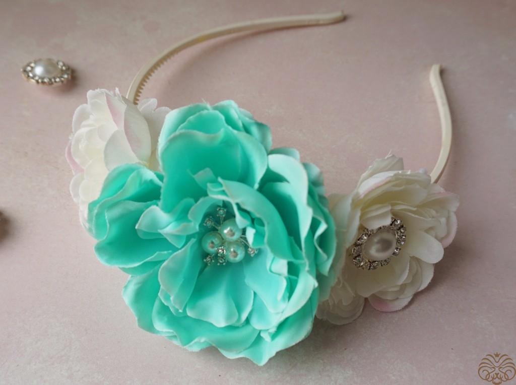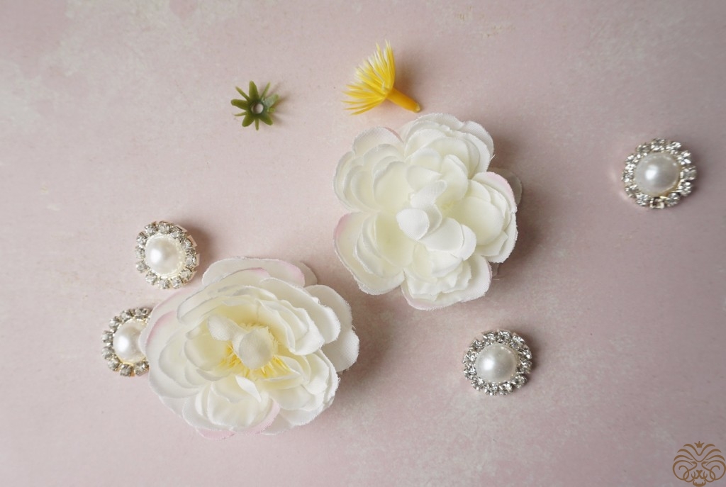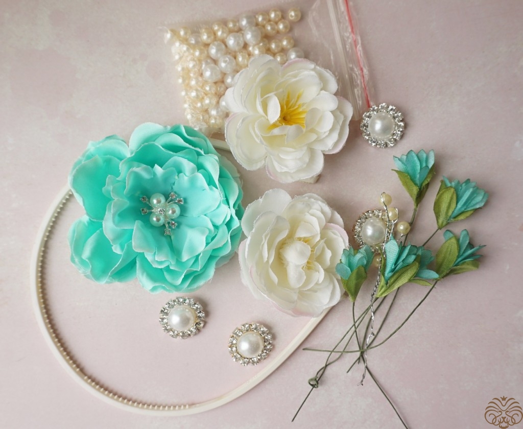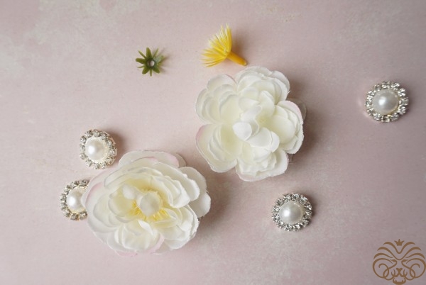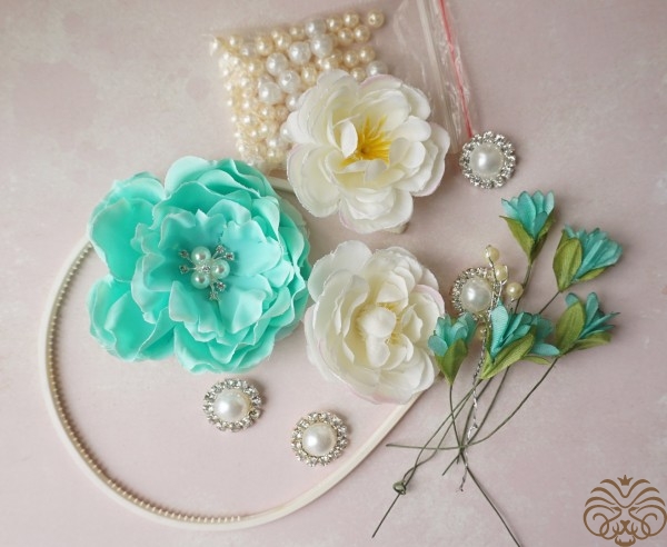 Для создания ободка нам потребуются: тканевые цветы, бутоны, небольшие броши из страз, основа для ободка, бусины - по желанию.