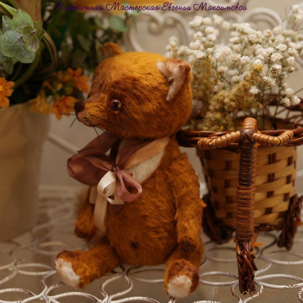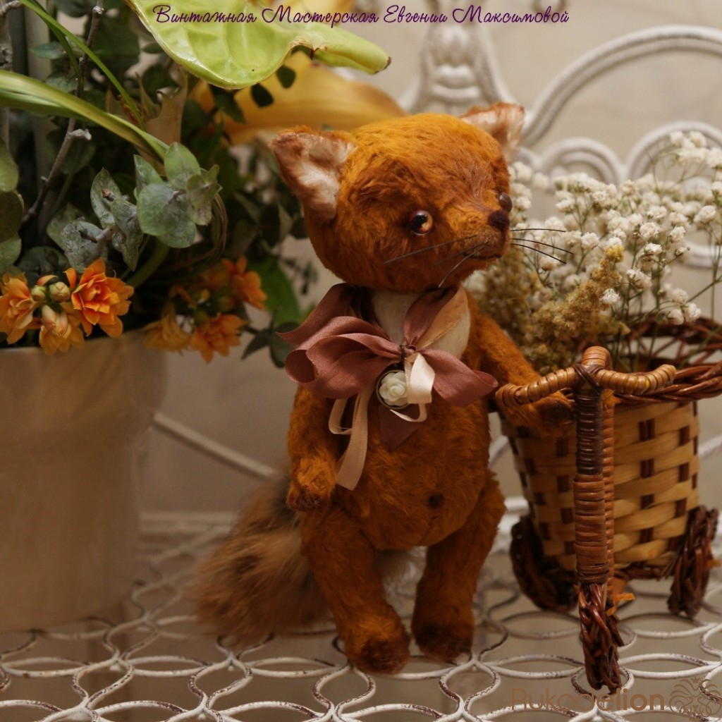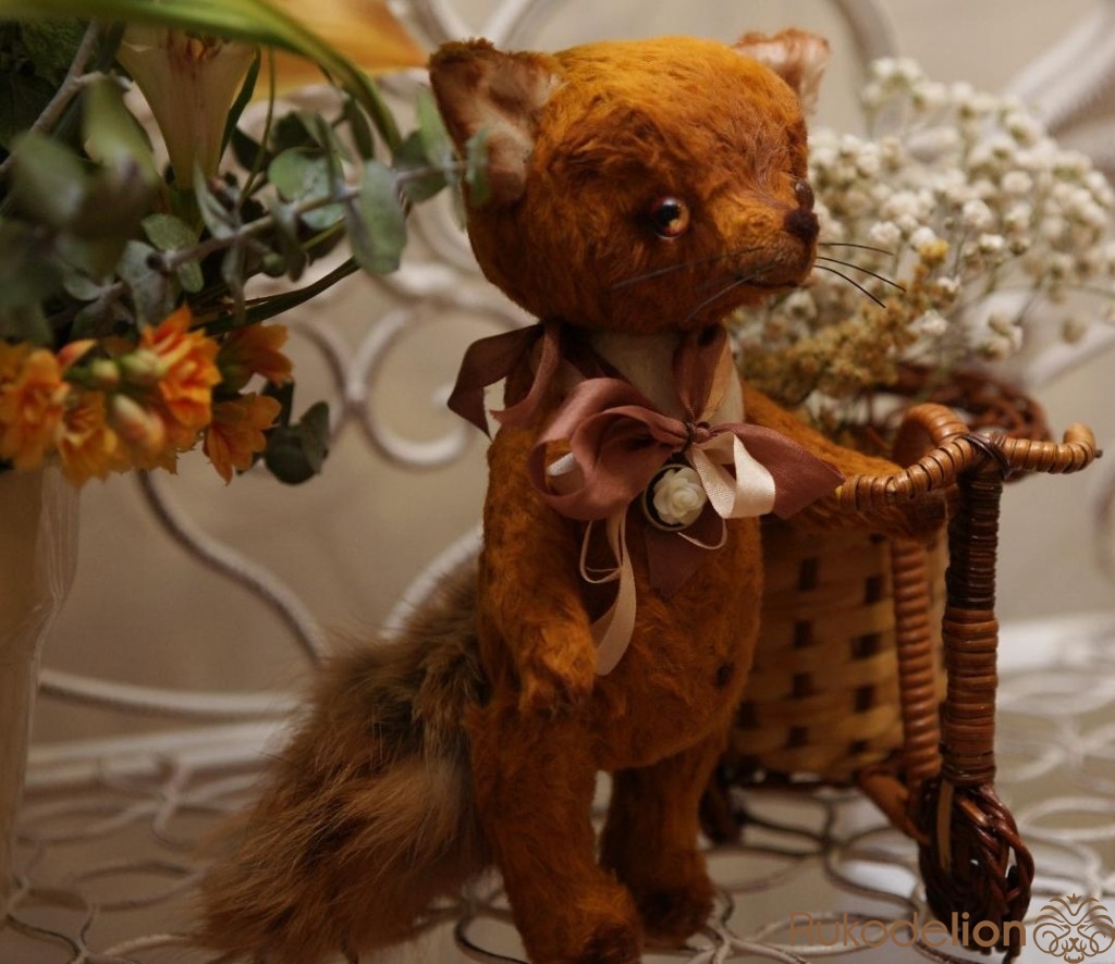 Малыш сшить из немецкой вискозы,шплинтовое крепление, глазки стеклянные- ручная работа, носик и воротничок сделан в технике сухого валяния. Набит холофайбером, тонирован масляными красками. Хвостик из натурального меха лисы.