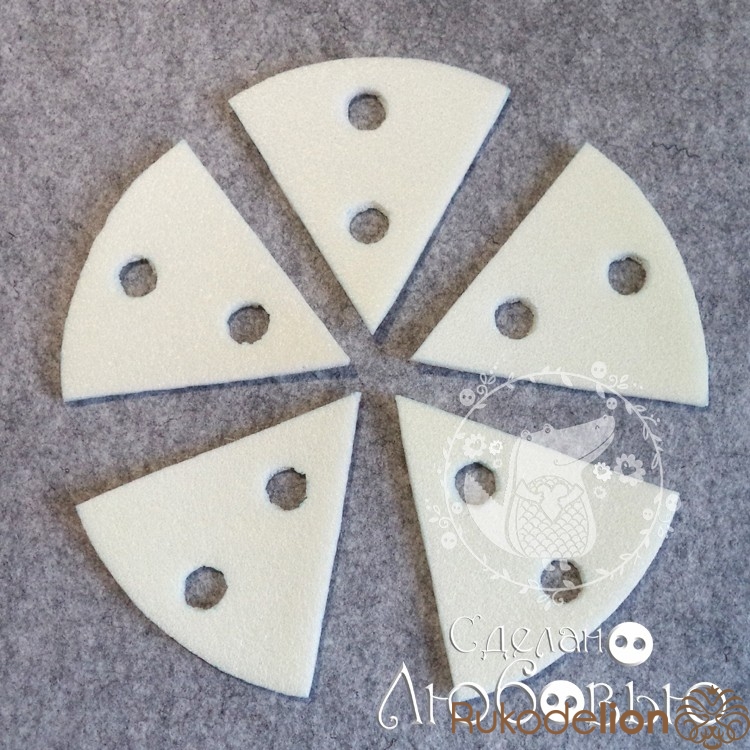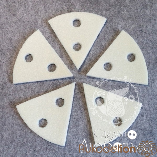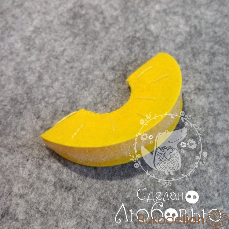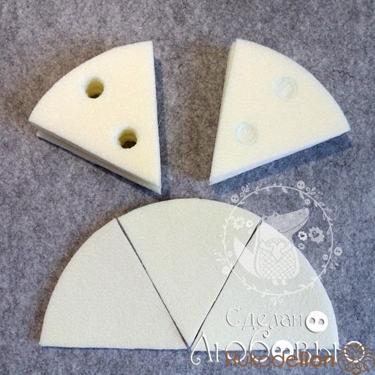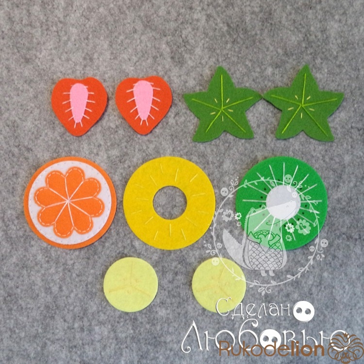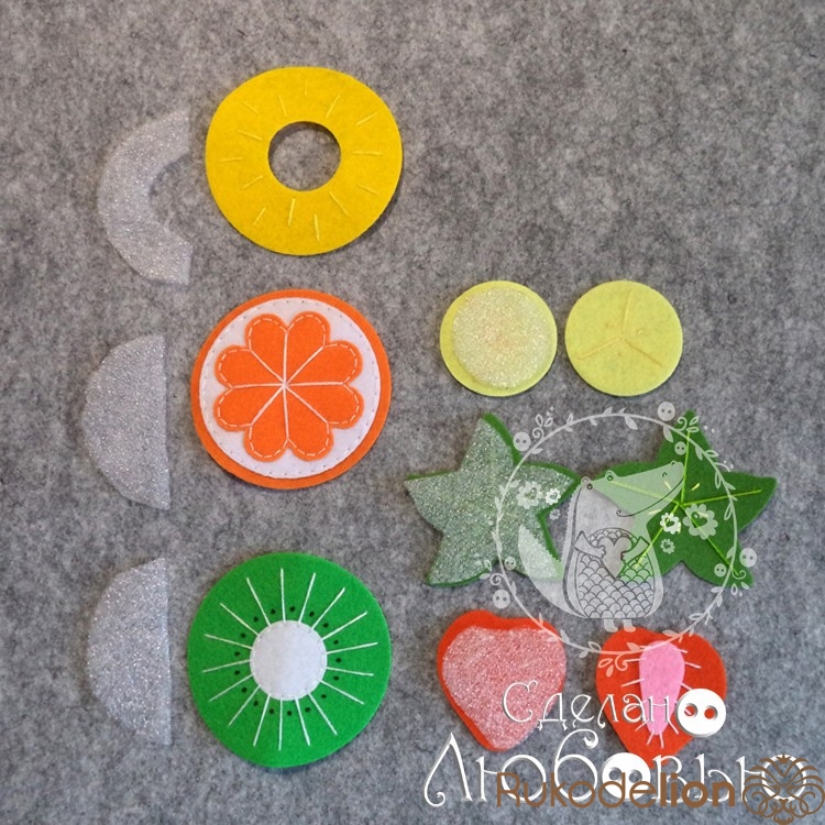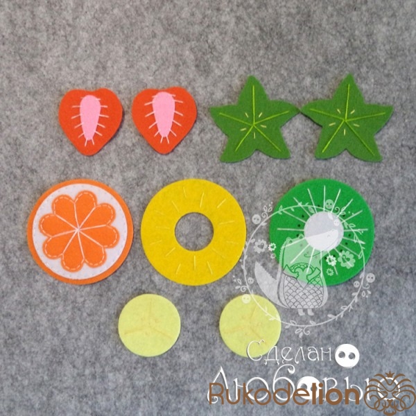Из жесткого фетра вырезаем детали, как показано на фото. Также вырезаем детали из подложки под ламинат. Она послужит нам "наполнителем" для фруктов. Если мы фрукты будем набивать синтепухом, они станут слишком объемными, а нам нужно добиться эффекта "нарезанных фруктов".