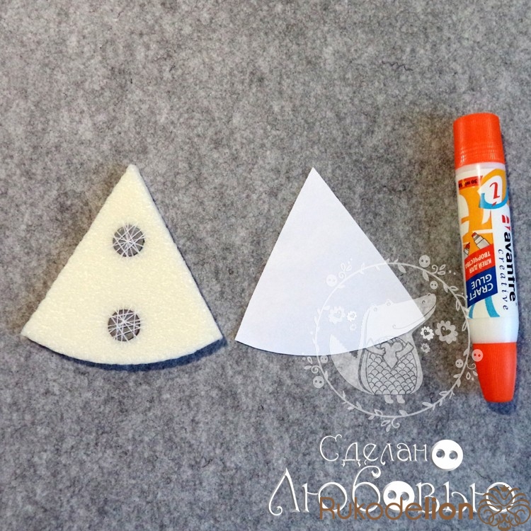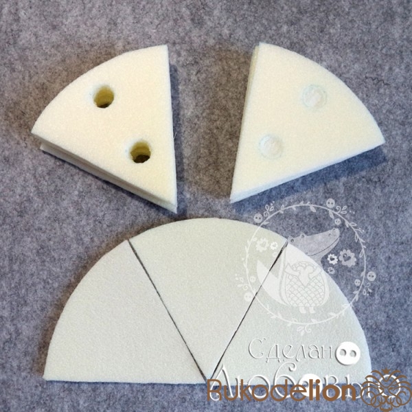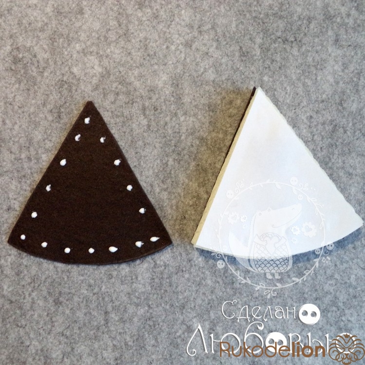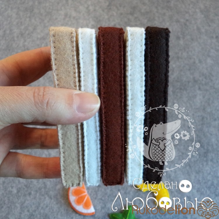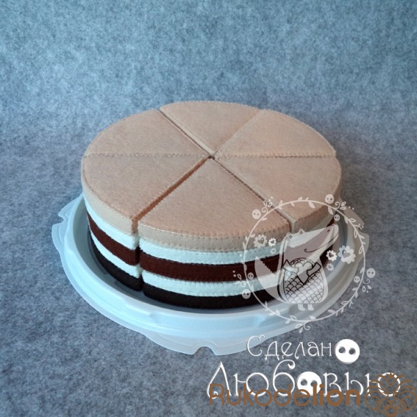 Таким образом, собираем весь кусок торта, 3 "коржа" и 2 "крема". Склеенные заготовки обшиваем "через край" обычной швейной нитью в два сложения, при этом сильно не стягиваем, чтобы края не деформировались.