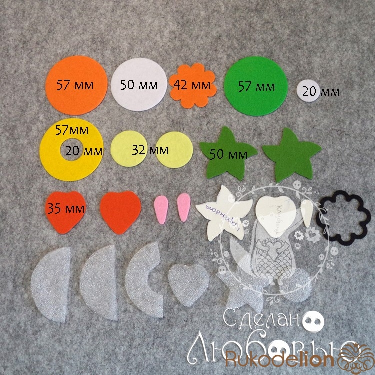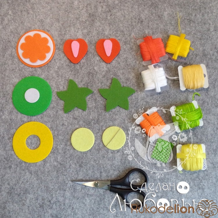 Фетр жесткий: белый, бледно желтый, желтый, оранжевый, бледно розовый, красный, 2 оттенка зеленого. Я использую корейский жесткий фетр.