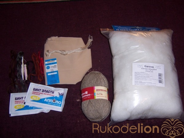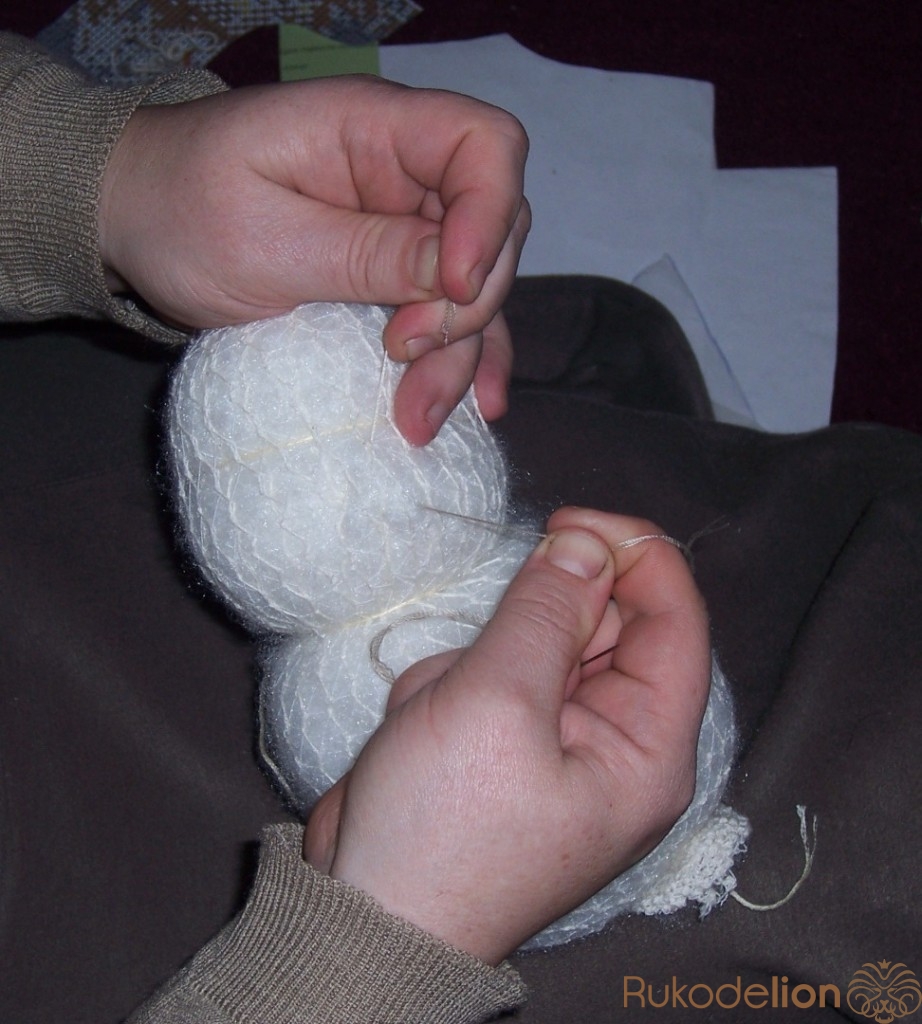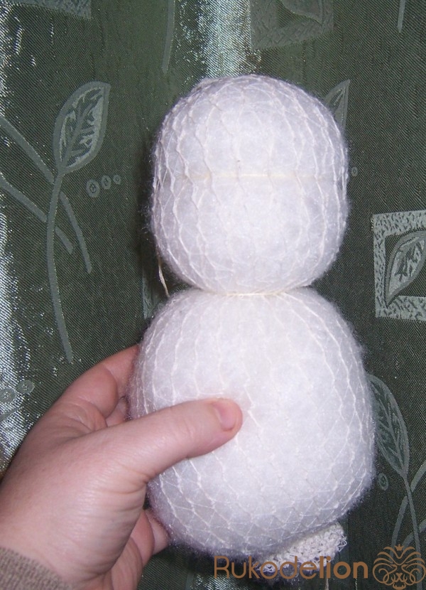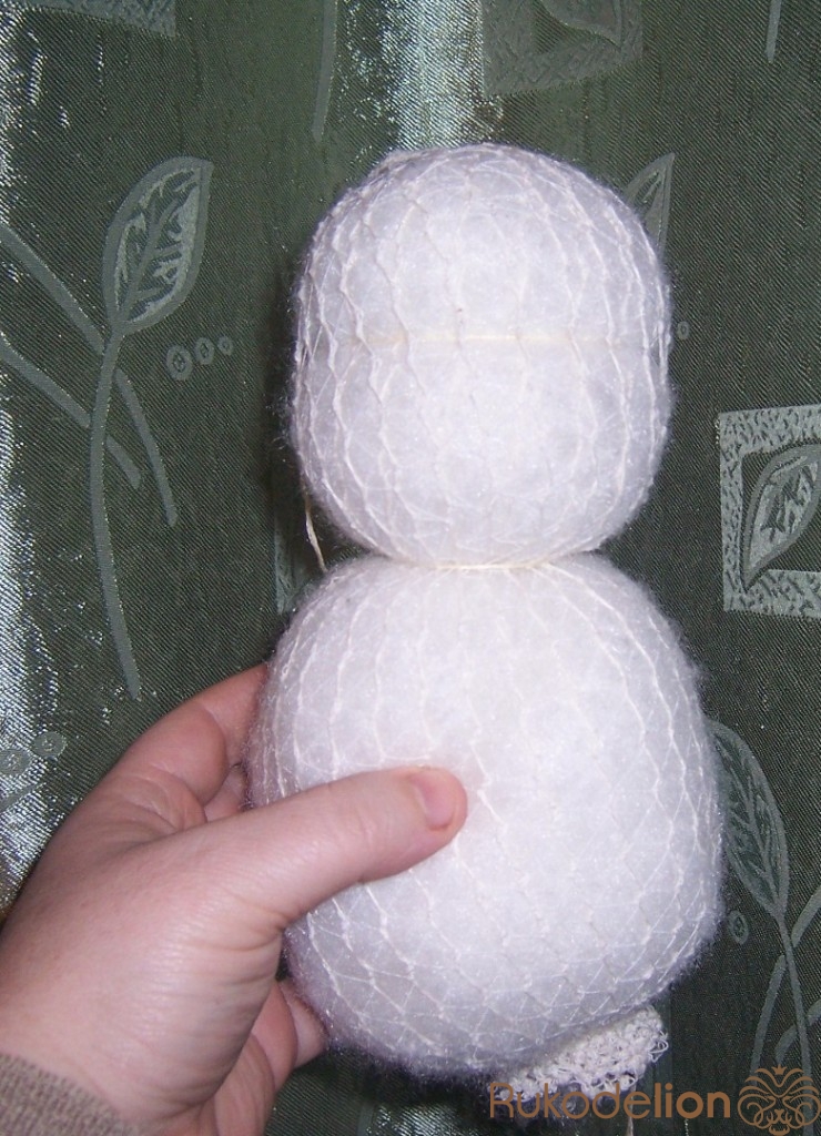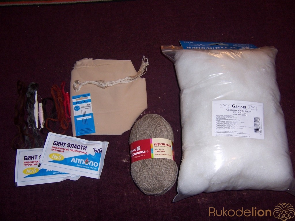 От эластичного бинта-чулка отрезать отрезок длиной ок.30 см и туго перевязать верхний конец. Из наполнителя сформировать тугой шар для головы и натянуть поверх него перевязочный бинт.Бинт ещё раз туго перевязать внизу головы. Голову туго перевязать по одному разу вдоль и поперёк по линии середины для создания рельефа лица(глазные впадины и щёки). От эластичного бинта-чулка отрезать ок.40 см,бинт вывернуть,натянуть на голову,туго перевязать под головой и набить синтепухом(внутренняя часть торса).