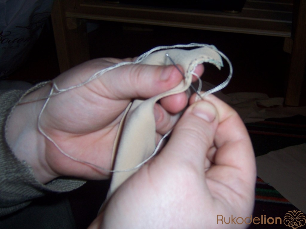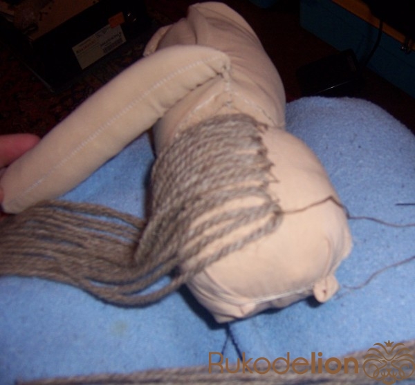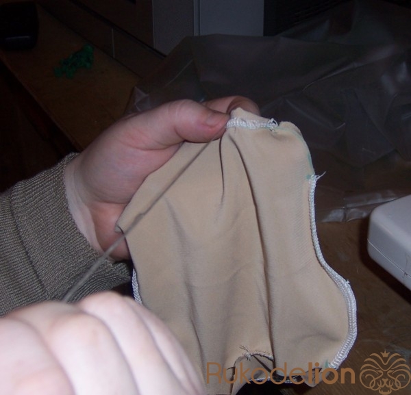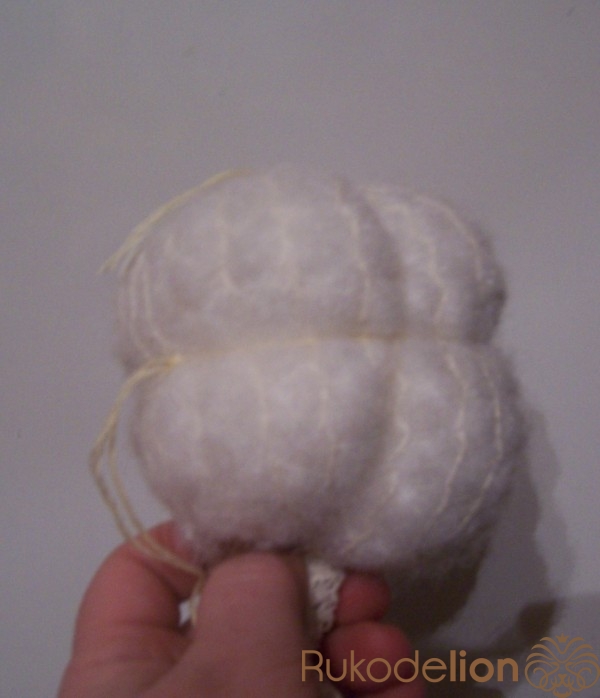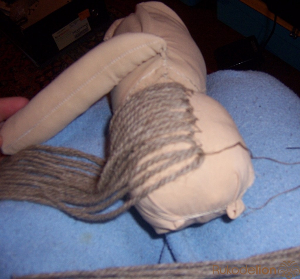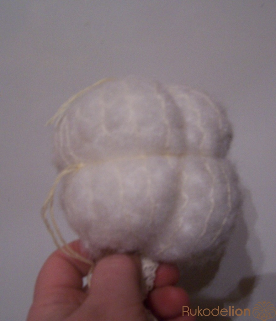 От эластичного бинта-чулка отрезать отрезок длиной ок.30 см и туго перевязать верхний конец. Из наполнителя сформировать тугой шар для головы и натянуть поверх него перевязочный бинт.Бинт ещё раз туго перевязать внизу головы. Голову туго перевязать по одному разу вдоль и поперёк по линии середины для создания рельефа лица(глазные впадины и щёки). От эластичного бинта-чулка отрезать ок.40 см,бинт вывернуть,натянуть на голову,туго перевязать под головой и набить синтепухом(внутренняя часть торса).